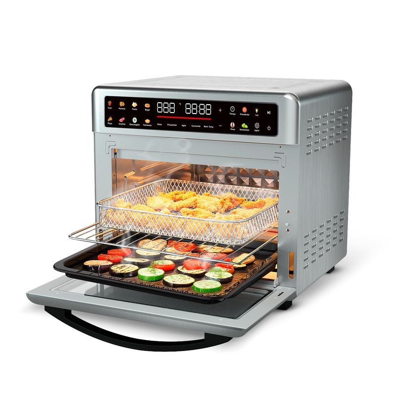 Este horno de 25 litros combina potencia y funcionalidad para cocinar de forma rápida y uniforme gracias a su sistema de circulación de aire caliente. Ideal para hornear, tostar, asar o freír sin aceite, brindando resultados crujientes y saludables.