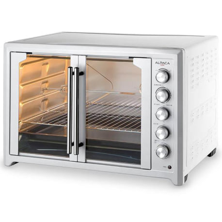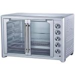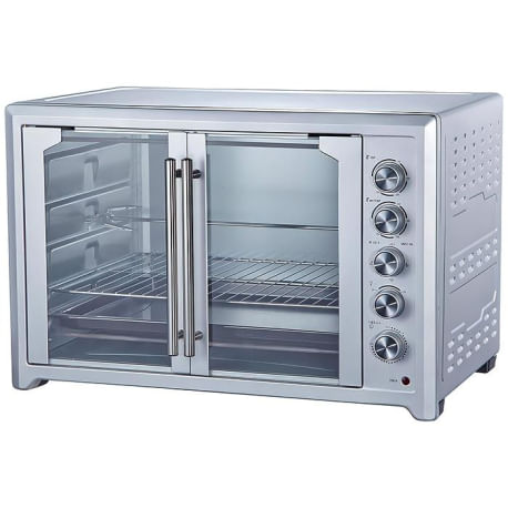 Es un horno de mesa electrico de 100 litros con diseño compacto ideal para cocinas pequeñas o espacios profesionales. Funciona con una potente potencia de 2 800 W y ofrece un sistema de conveccion que asegura una coccion uniforme. Su estructura en acero inoxidable y puertas francesas aportan durabilidad y estilo. Tiene control mecanico de temperatura (100 °C a 250 °C) con timer integrado para mayor comodidad.