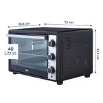 Horno Eléctrico BGH BHE40M23N de 40 litros en color negro. Ideal para cocinar, tostar y gratinar de forma rápida y práctica. Cuenta con función grill, termostato regulable y timer de 60 minutos con alarma sonora. Su rango de temperatura va de 100°C a 230°C y dispone de 3 niveles internos para preparar varios alimentos a la vez. Incluye rejilla, bandeja y bandeja recogemigas. Tiene puerta con 1 vidrio, eficiencia energética B y montaje de mesa. Funciona a 220V. Dimensiones: 51 cm de ancho, 32,3 cm de alto y 39 cm de profundidad. Peso: 7 kg.