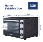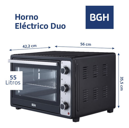 El BGH BHE55M23N es un horno eléctrico con un diseño moderno en color negro. Cuenta con una puerta de vidrio amplia y perillas de control accesibles. Además, dispone de tres posiciones de bandeja para seleccionar según el tipo de alimentos que se quieran preparar. Su capacidad es de 55 litros.