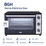 El BGH BHE55M23N es un horno eléctrico con un diseño moderno en color negro. Cuenta con una puerta de vidrio amplia y perillas de control accesibles.