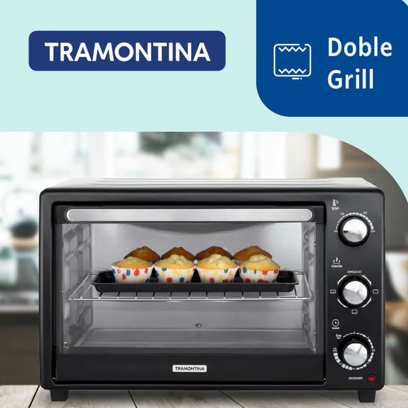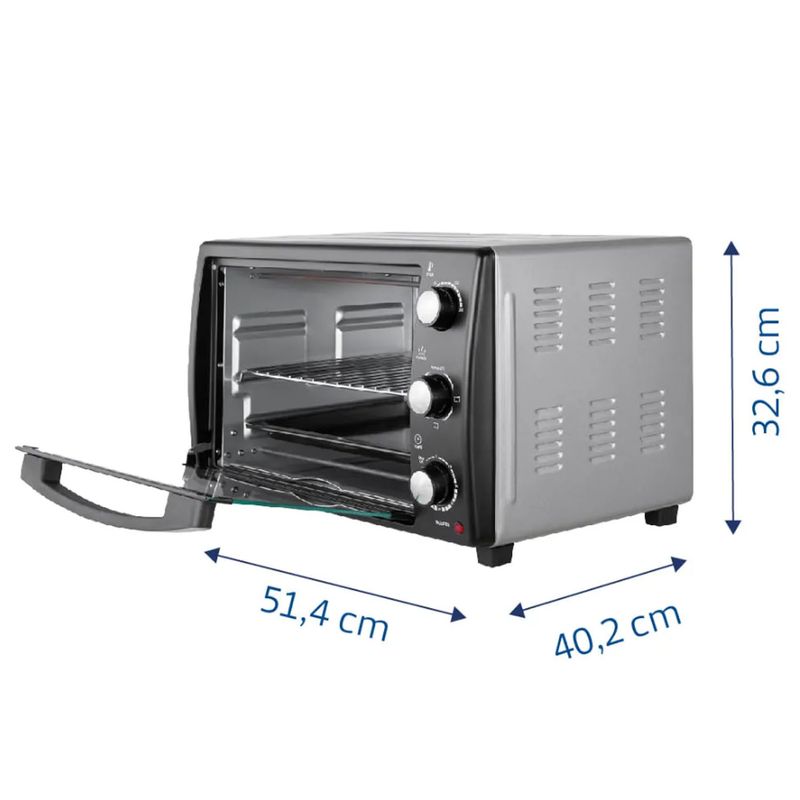 Es un horno eléctrico con un diseño moderno y funcional en color acero inoxidable y negro. Cuenta con una puerta de vidrio amplia y comandos de control accesibles. Además, dispone de tres posiciones de bandeja para seleccionar según el tipo de alimentos que se quieran preparar. Accesorios incluidos: Rejilla de Grill, Bandeja Asadera Esmaltada, y Bandeja portamigas.