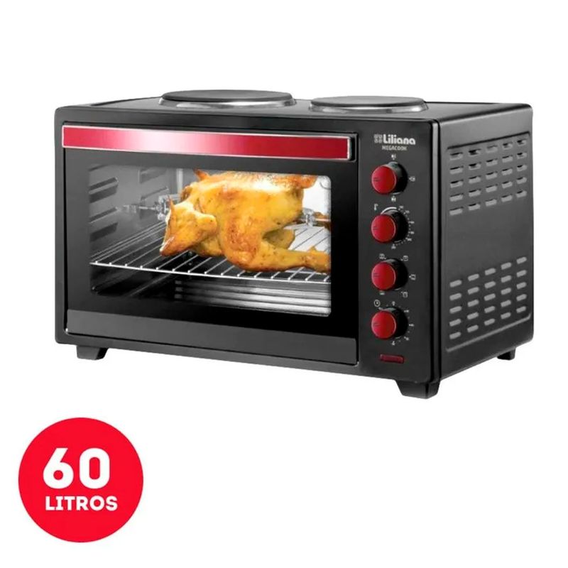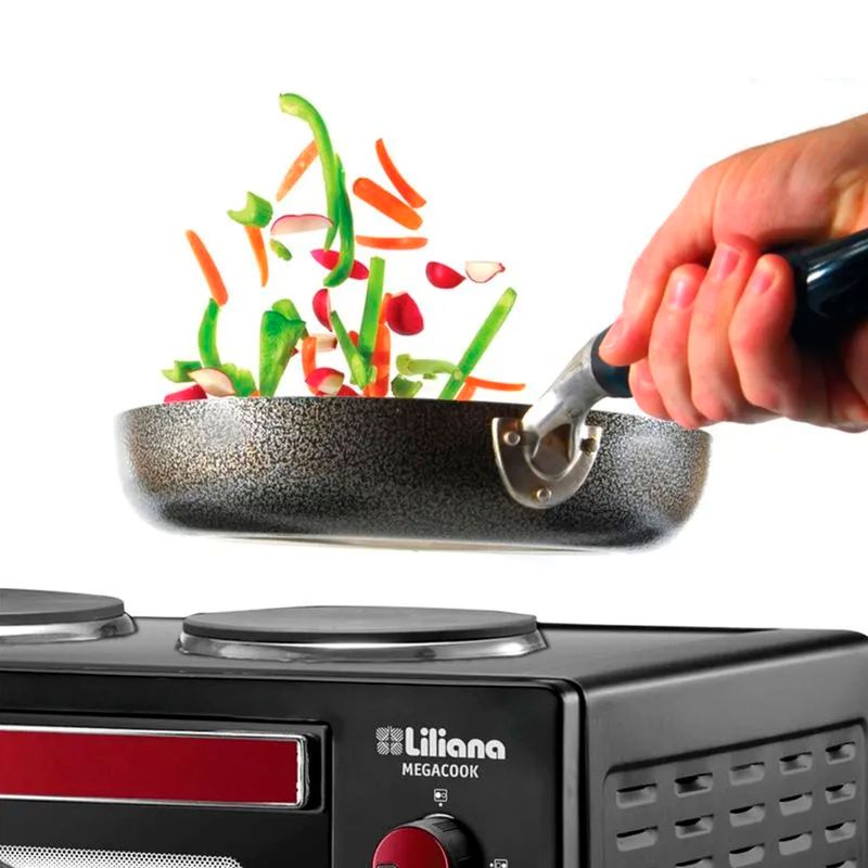 Horno Eléctrico Liliana MegaCook – Todo en uno para cocinar como un profesionalEl Horno Eléctrico MegaCook de Liliana es la solución ideal para quienes buscan versatilidad, potencia y practicidad en la cocina. Su diseño todo en uno combina horno con convección forzada, 2 anafes integrados y spiedo rotativo, permitiéndote hornear, asar, gratinar y cocinar múltiples preparaciones con resultados parejos y sabrosos. Una opción completa para optimizar espacio, tiempo y rendimiento, con la calidad y el respaldo de Liliana.