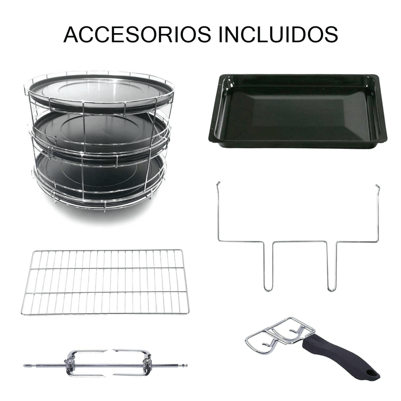 • Incluye accesorios para espiedo, parrilla, bandeja multiuso, 3 bandejas pizzeras de 30cm antiadherentes, pinza para bandejas y pinza para espiedo.
