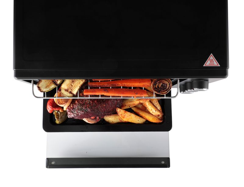 Incluye bandeja y parrilla regulables, junto con una bandeja recolectora de migas, facilitando tanto la cocción como la limpieza.