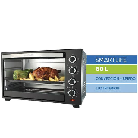 Horno eléctrico Smartlife SL/TOR060, cuenta con una capacidad de 60 lts , 6 funciones de cocción, luz interior, regulador de temperatura de 100øC a 250øC, temporizador hasta 60 minutos, incluye bandeja de alimentos, manipulador de bandeja, bandeja junta miga, accesorio para spiedo y manipulador de spiedoVolumen ÚtilEl volumen útil puede depender del diseño del horno y de cómo se distribuyen estos elementos. Por lo general, el volumen útil suele ser entre un 70% y 90% del volumen total. Por lo tanto, el volumen útil del horno podría estar entre 42 y 54 litros, dependiendo del diseño específico. Para obtener la cifra exacta, consulta las especificaciones técnicas del fabricante.Función SpiedoLa función spiedo en un horno eléctrico permite cocinar alimentos de manera uniforme mediante un asador giratorio, utilizando calor constante. Es ideal para lograr una cocción homogénea y resaltar jugosidad y textura.