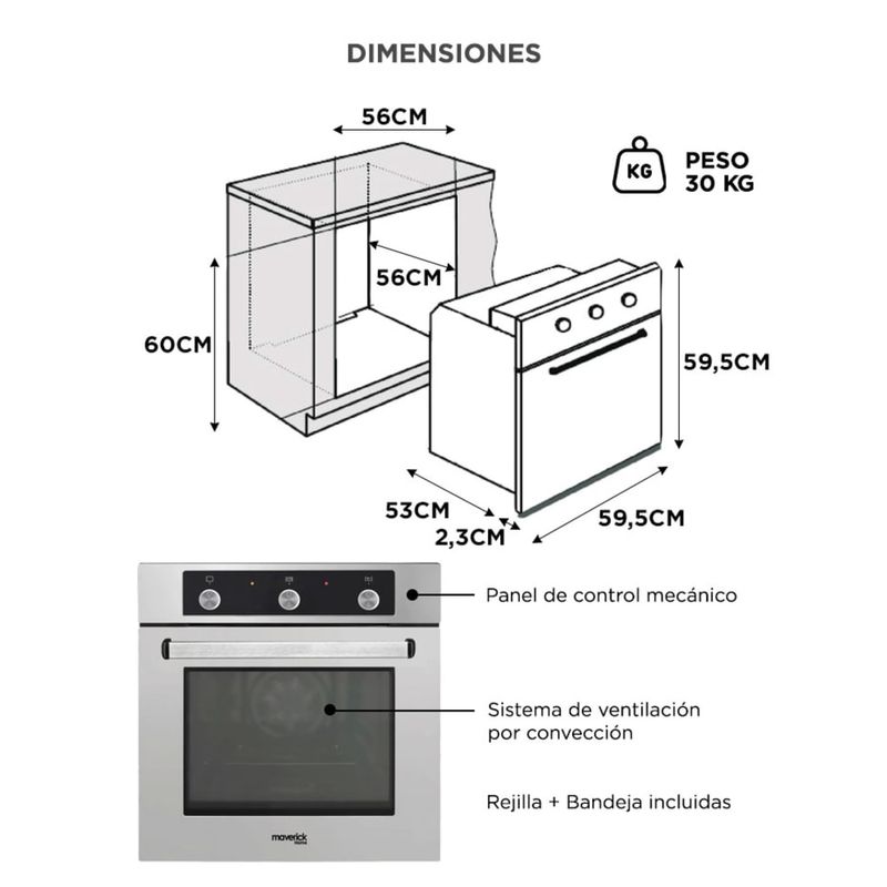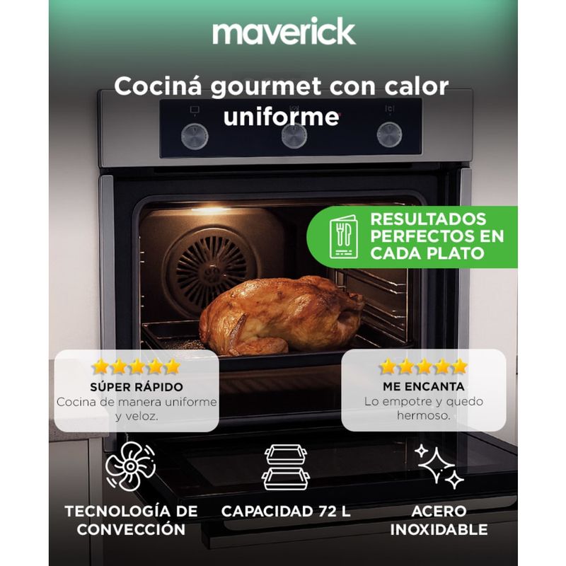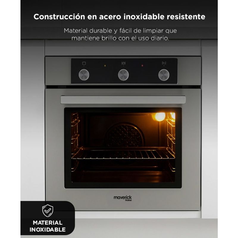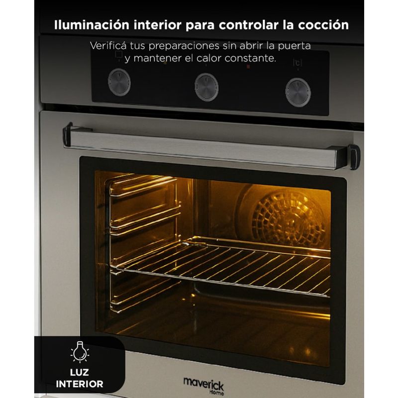 El horno empotrable Lyon 2 Maverick combina un frente de acero inoxidable con un formato de sesenta centímetros que se integra fácilmente en cocinas contemporáneas. Su estilo minimalista aporta una apariencia premium que realza muebles y mesadas. Es una excelente opción para quienes buscan estética y funcionalidad en un mismo equipo.
