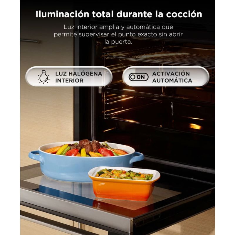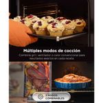 Incorpora control termostatico manual que permite regular la temperatura interna segun el tipo de alimento. El control gradual facilita ajustes precisos durante horneado coccion o gratinado. Este sistema garantiza estabilidad termica para resultados repetibles y controlados en uso domestico continuo.