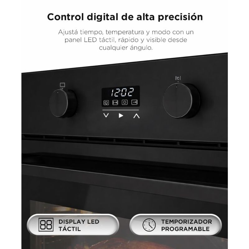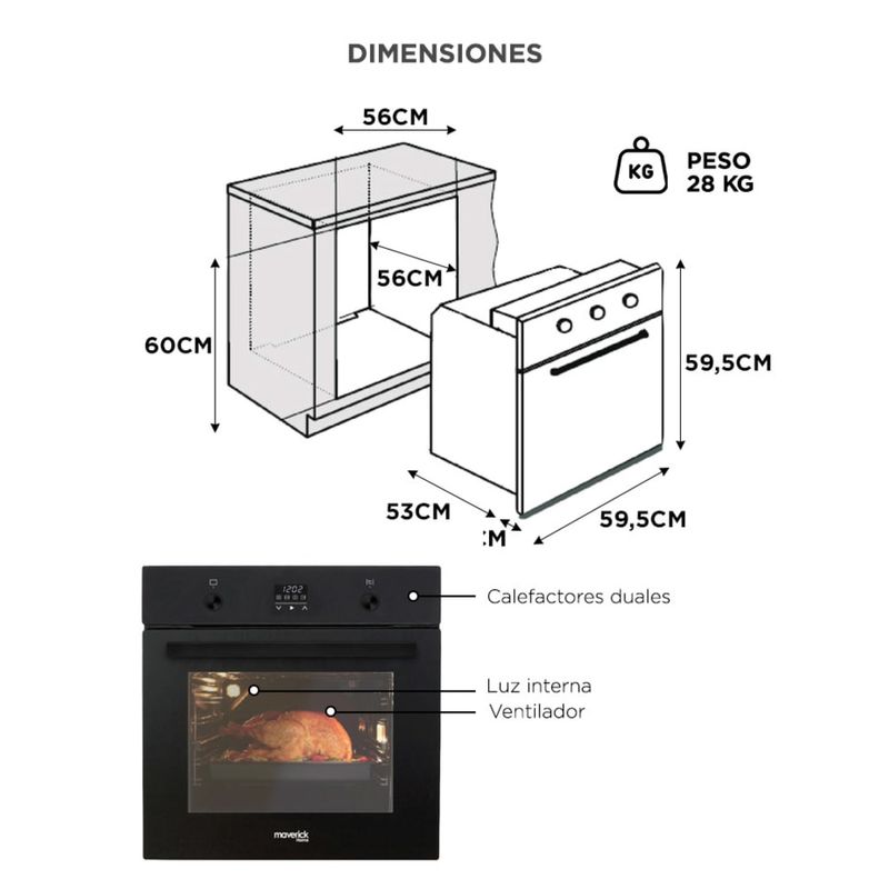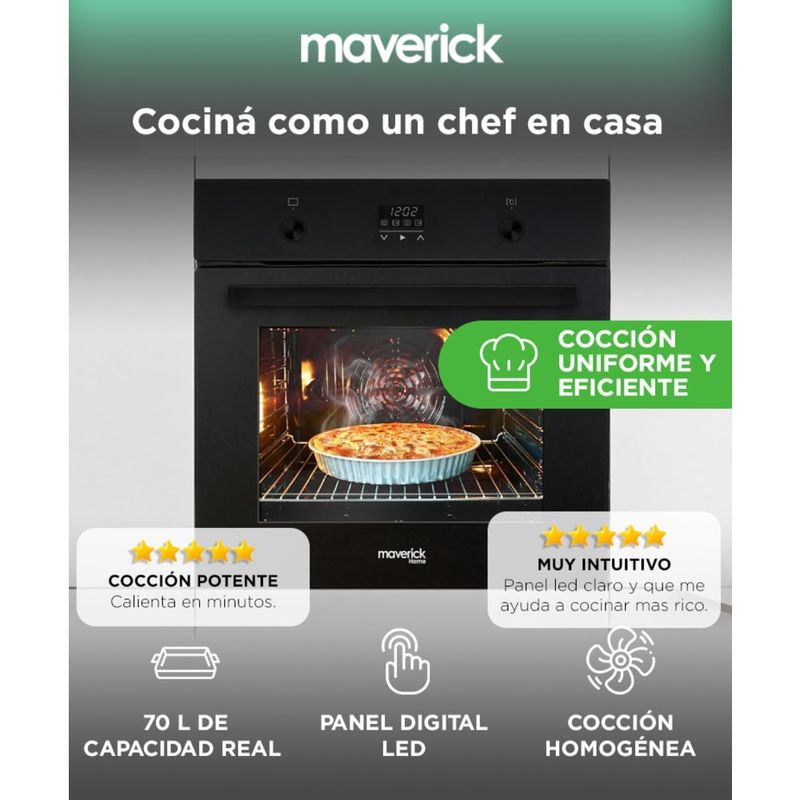 El horno empotrable Maverick Black Premium funciona mediante resistencias electricas que generan calor estatico dentro de una camara cerrada. Este sistema permite mantener una temperatura uniforme durante todo el ciclo de coccion. La camara metalica optimiza la retencion termica reduciendo perdidas de calor.