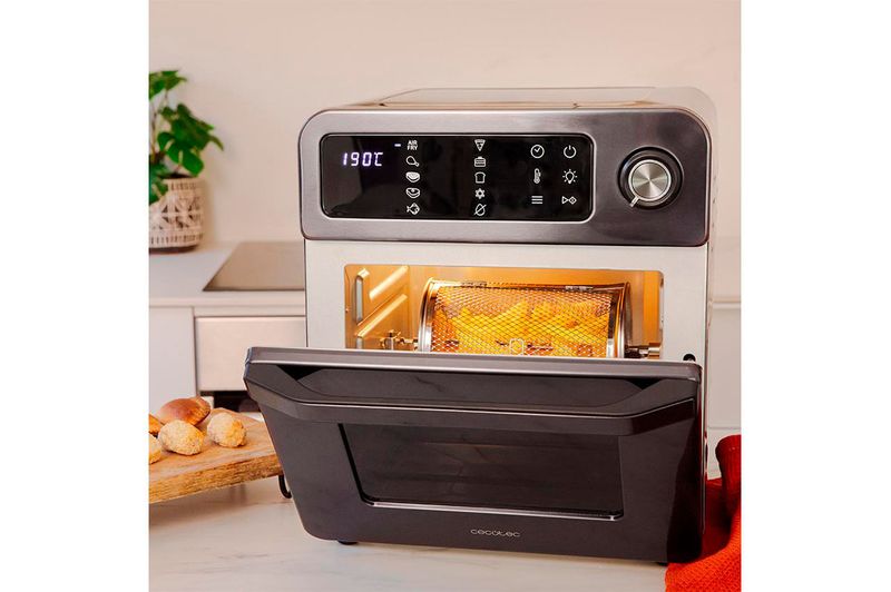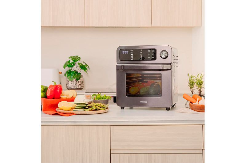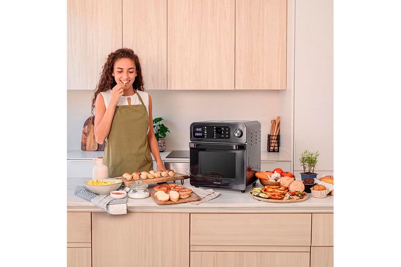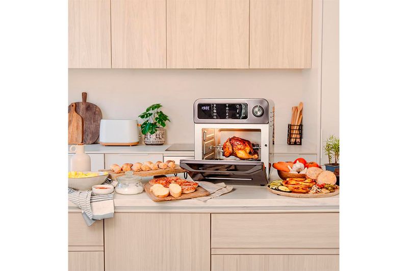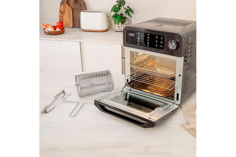 - Capacidad de 15 L: el horno freidora dispone de un tamaño compacto apto para introducir un pollo o pavo entero de hasta 800 g.