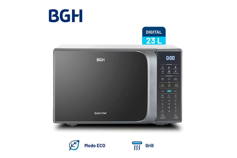 El microondas digital BGH B223DS20I de 23 litros combina tecnología, diseño y practicidad para simplificar tu rutina diaria en la cocina. Con su moderno exterior color silver y puerta tipo mirror, aporta estética contemporánea a cualquier ambiente. Su control digital por membrana y display LED blanco permiten un manejo cómodo, preciso e intuitivo.