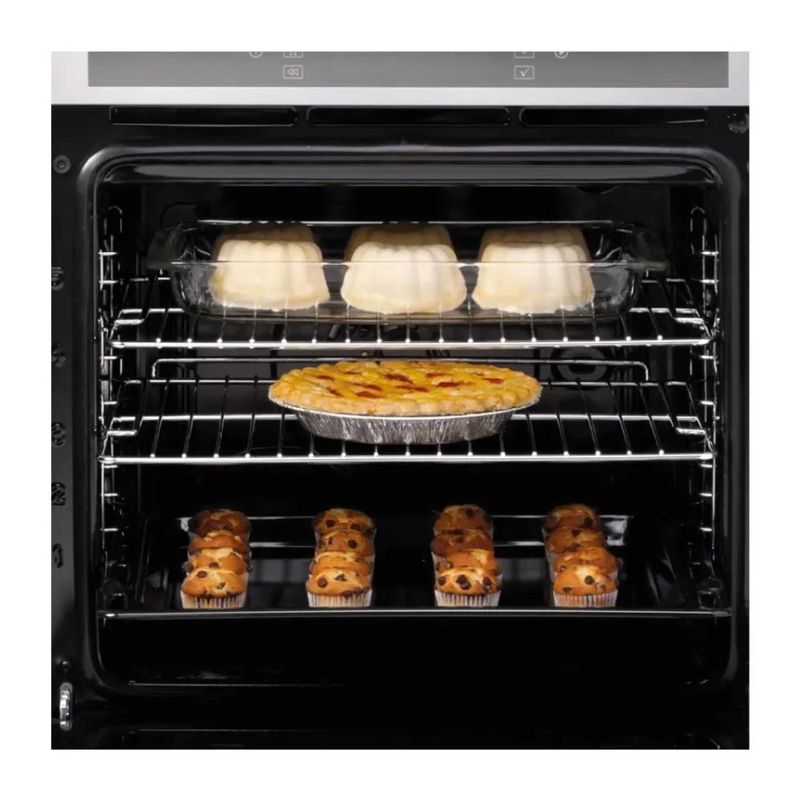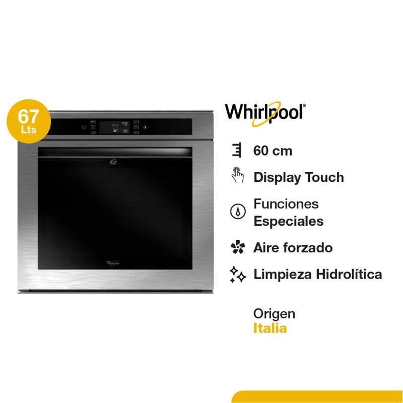 El horno empotrable eléctrico Whirlpool 60 cm Inox AKZM656IX es un electrodoméstico de diseño italiano que incorpora la avanzada tecnología 6to Sentido de Whirlpool, ofreciendo 30 programas de cocción preestablecidos que ajustan automáticamente el tiempo y la temperatura para obtener resultados óptimos. Con una generosa capacidad de 67 litros, este horno cuenta con múltiples funciones versátiles, incluyendo convección (que permite cocinar hasta tres platos simultáneamente sin mezclar sabores gracias a la función Cook3), grill y precalentado rápido. Su diseño elegante se complementa con un panel de control digital de uso intuitivo, perillas retráctiles y una puerta con triple vidrio templado, que mejora la seguridad y la eficiencia energética.