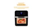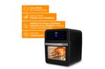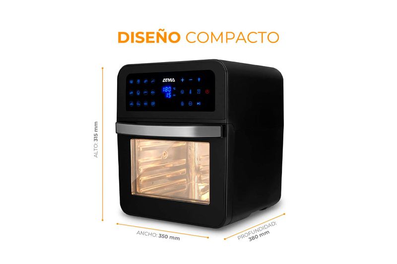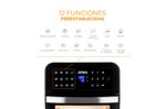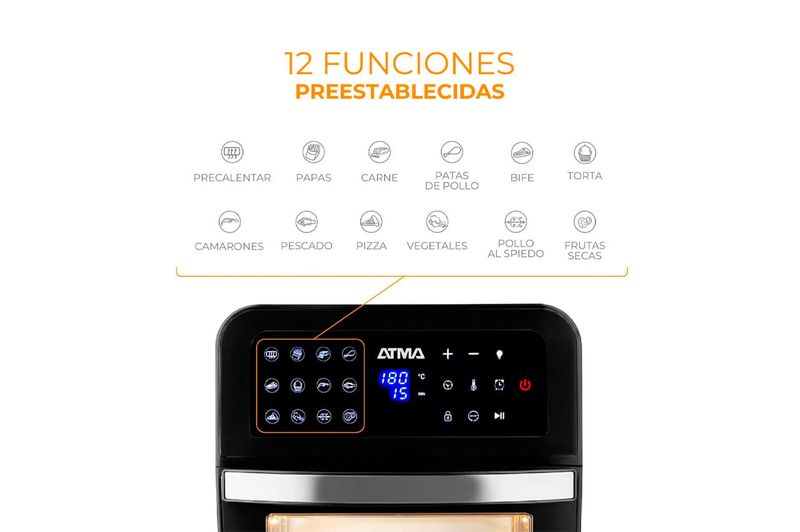 - 12 funciones preestablecidas: Precalentar, camarones, pizza, vegetales, parrilla, frutas secas, bife, carne, papas, aves, torta, pescado.