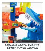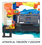 Un enorme tiburón acecha bajo el garaje de Hot Wheels City para atacar y devorar a los vehículos incautos. ¡Atrápalo y libera a tus amigos para salvarlos!