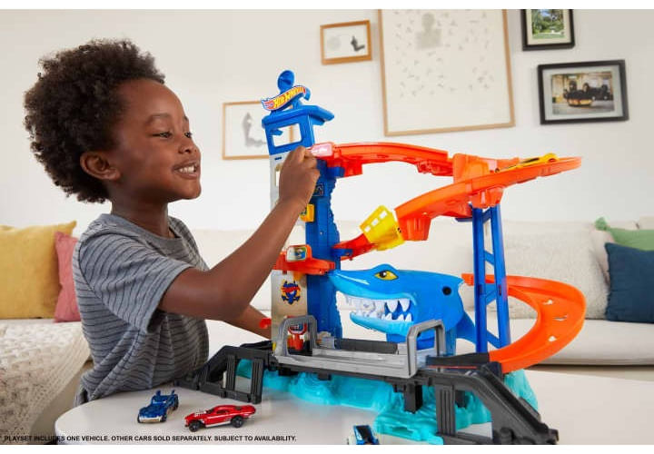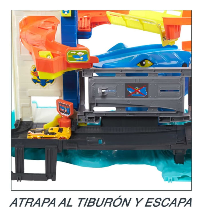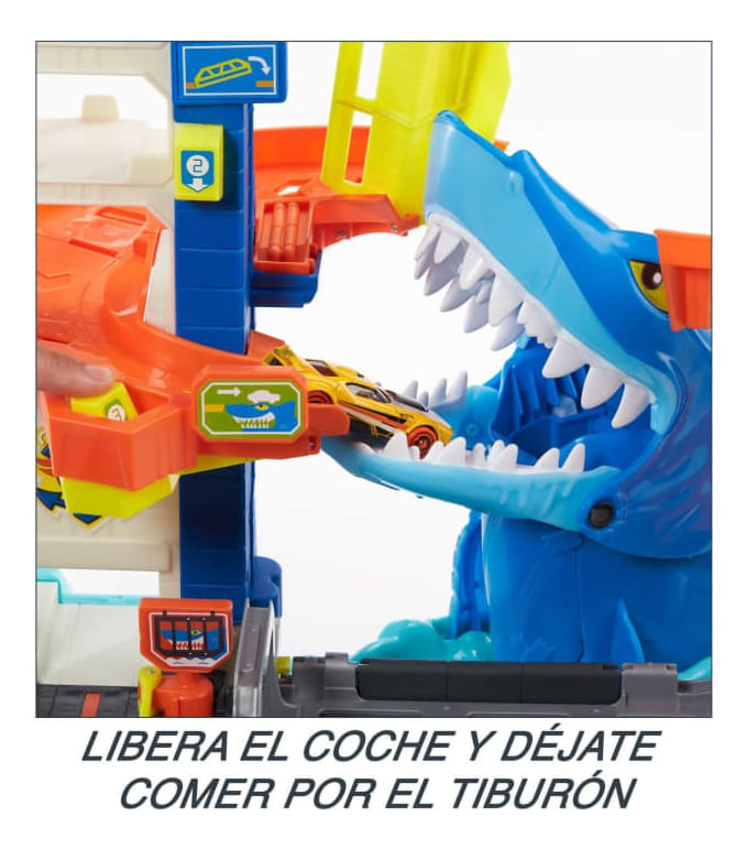 Conduce por el garaje de Hot Wheels City, pero ten cuidado con el peligroso tiburón que ataca y devora vehículos incautos. Este conjunto de juego cuenta con tres interruptores que activan el tiburón de manera aleatoria para que irrumpa en la pista y devore el coche. Si llegas hasta el final, el tiburón se queda encerrado en la jaula y los coches atrapados se liberan. Incluye un vehículo de Hot Wheels, pero hay sitio para aparcar más coches. (Los vehículos adicionales se venden por separado). Conéctalo a otros conjuntos y piezas de pista de Hot Wheels para construir un paisaje urbano único