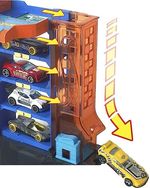 Hay un montón de estacionamiento e impresionante en el parque de coches Hot Wheels City Downtown con 4 niveles para contener 4 vehículos diferentes, además de características móviles como elevación manual de coche, "cargador" de vehículo eléctrico y rampa de salida translúcida