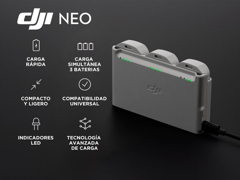 Equipado con indicadores LED que muestran el estado de la carga, el DJI NEO te permite controlar fácilmente el proceso de carga, asegurando que siempre estés preparado para el próximo vuelo
