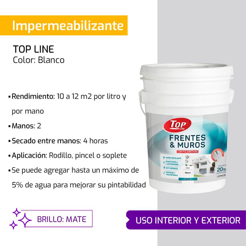 Impermeabilizante Con Poliuretano Frentes Y Muros Hidrorepelente Blanco Top Line 20 Lts