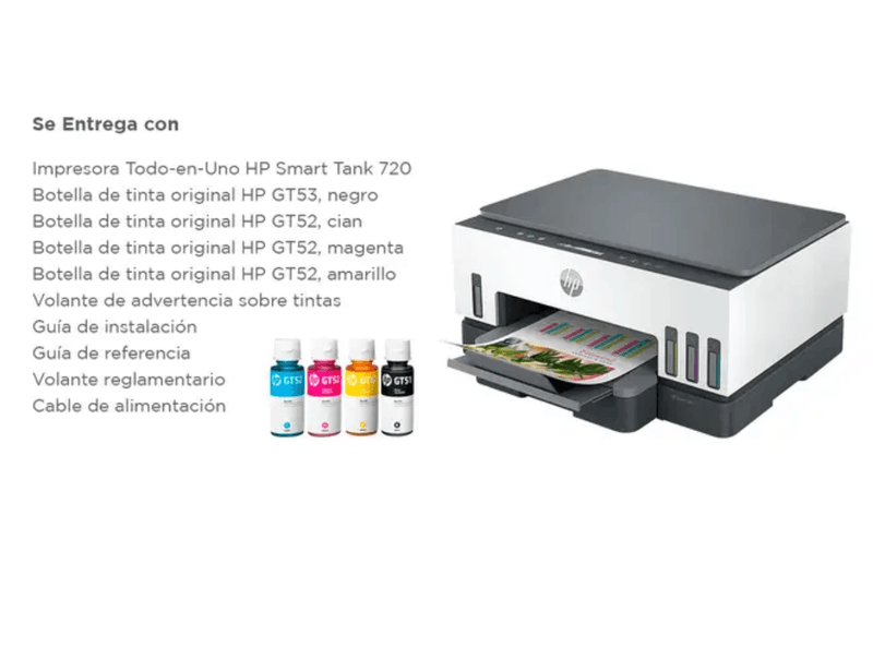 Insumos compatibles: Botella de tinta hp GT53 negra, GT52 cian, GT52 magenta, GT52 amarillo.
