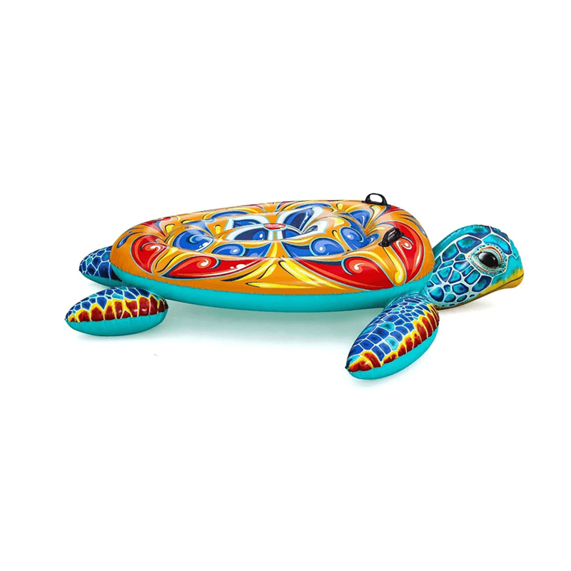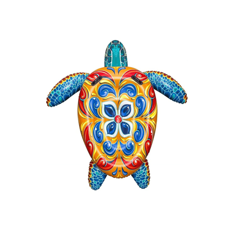 Gran tortuga inflable mediterránea para relajarse y jugar en el agua.