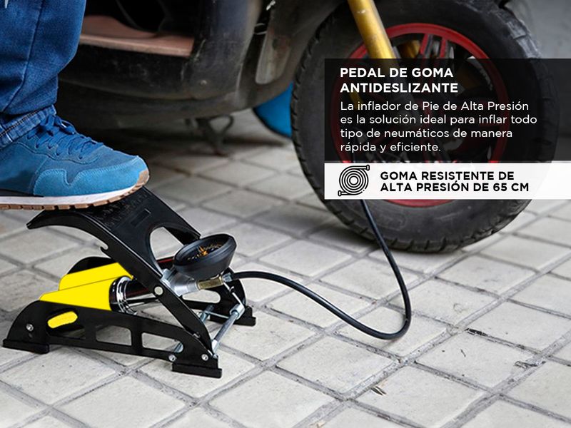 La inflador de Pie de Alta Presión es la solución ideal para inflar todo tipo de neumáticos de manera rápida y eficiente. Con su sistema de doble cilindro y manómetro de fácil lectura, garantiza un inflado preciso y sin esfuerzo. Fabricada con materiales resistentes como el aluminio y acero, y equipada con una manguera de alta presión de 65 cm, ofrece durabilidad y rendimiento superior. Además, su compatibilidad con válvulas Schrader, Presta y Dunlop la convierte en una herramienta versátil para ciclistas, motociclistas y aficionados al deporte.