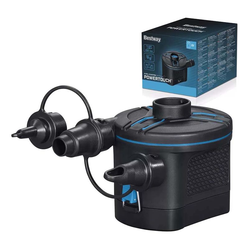 Este inflador sin cables y de diseño compacto, que funciona con cuatro pilas LR20/D (no incluidas), es ideal para viajar contigo a cualquier parte. Cuenta con una gran cámara de aire que ofrece un inflado rápido con un caudal de aire de 430 L/min, que permite inflar y desinflar de forma rápida y sencilla. Con su atractivo diseño bicolor, el inflador eléctrico PowerTouch con pilas de Bestway es la opción perfecta para utilizar en casa o en cualquier otro lugar.