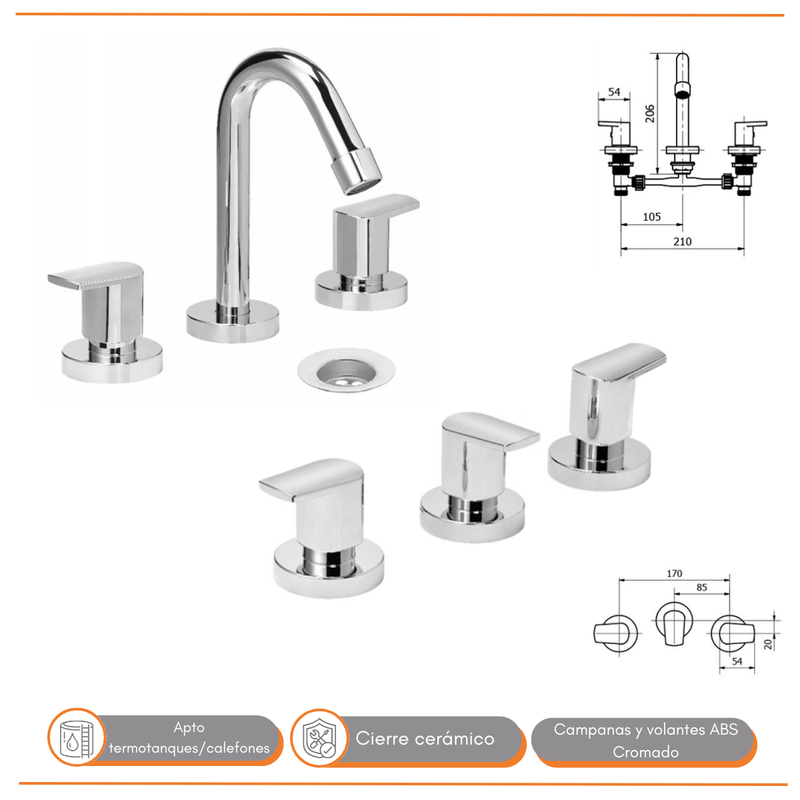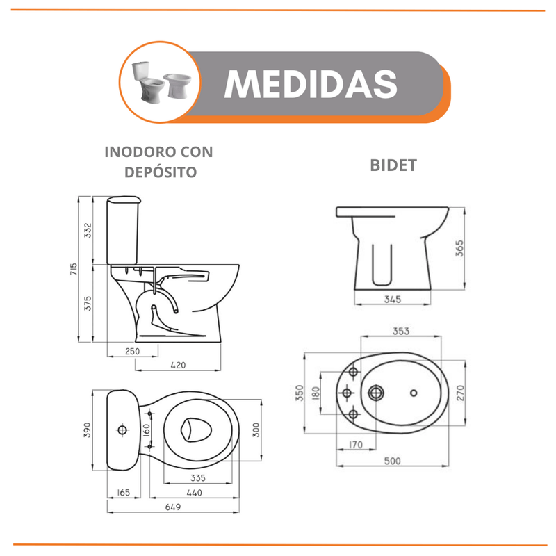 - INCLUYE: INODORO LARGO + DEPÓSITO DE APOYAR DOBLE DESCARGA + BIDET 3 AGUJEROS + GRIFERÍA DE LAVATORIO + GRIFERÍA DE BIDET + GRIFERÍA DE DUCHA.
