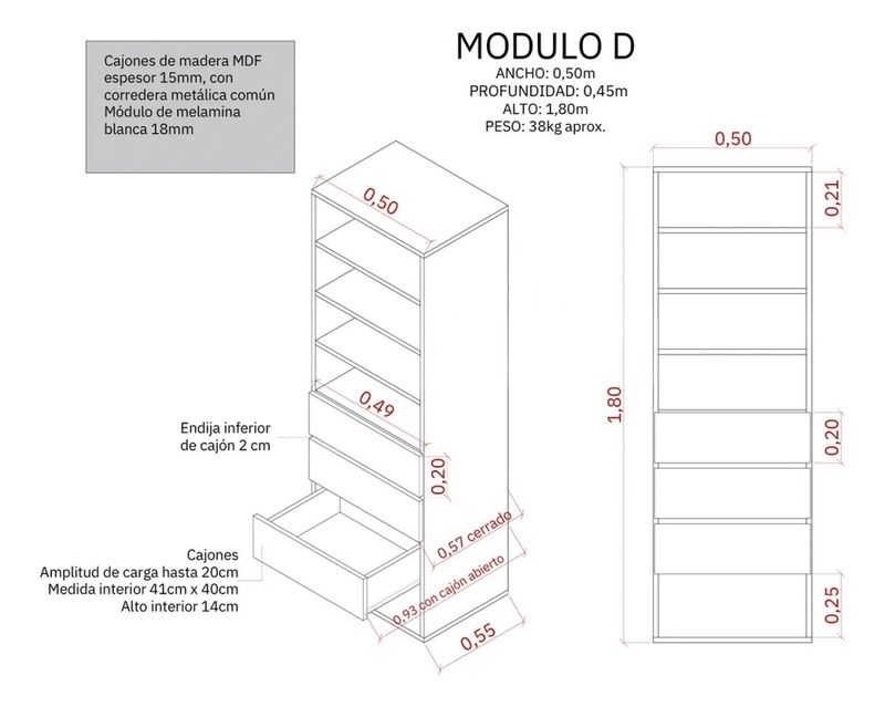 1,80 de alto x 0,50 m de ancho x 0,45 m de profundidad