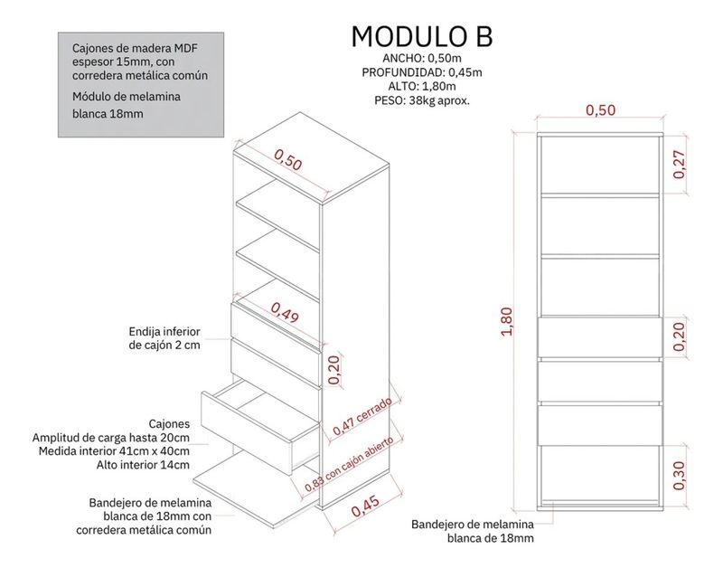 1,80 de alto x 0,50 m de ancho x 0,45 m de profundidad