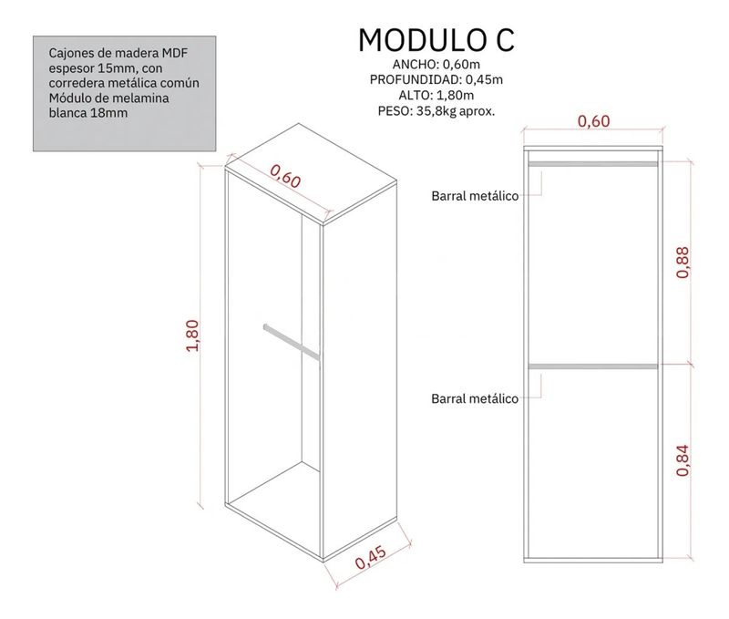 HogarDecoMueblesInterior De Placard Ropero Vestidor Modulo C de 0,60m + 2 barrales de 1,20mt