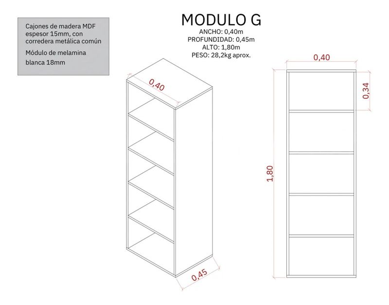1,80 de alto x 0,40 m de ancho x 0,45 m de profundidad
