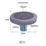 Su panel solar de 6V / 2W transforma la radiación solar en energía eléctrica continua, alimentando el proceso de ionización sin necesidad de baterías ni conexión eléctrica. Funciona de forma 100 % autónoma, incluso con nubes ligeras o media sombra.