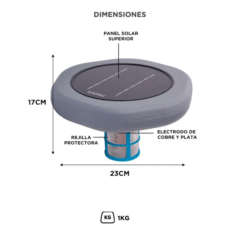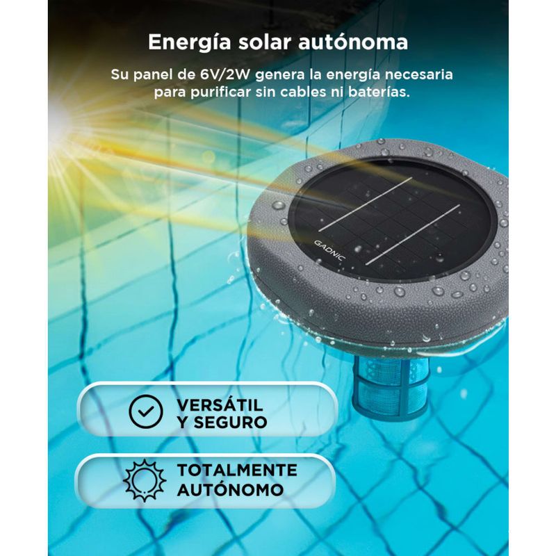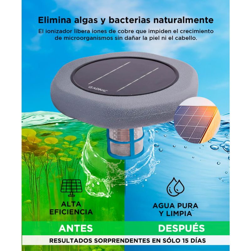 Mantené el agua de tu pileta cristalina, saludable y libre de químicos agresivos gracias a la tecnología de ionización solar GADNIC. Este sistema convierte la luz del sol en energía limpia para liberar iones de cobre que eliminan algas, bacterias y minerales no deseados, manteniendo tu piscina pura todo el verano.