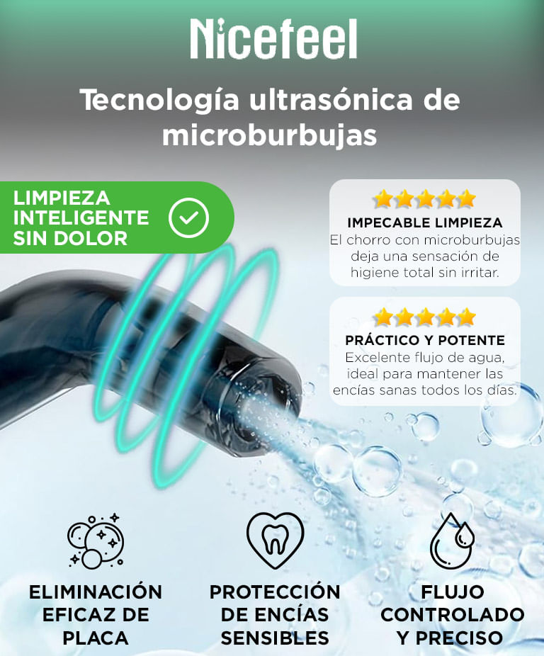 El irrigador bucal Nicefeel utiliza tecnología de flujo de agua con micro burbujas. Estas penetran suavemente entre dientes y encías. Permiten una limpieza profunda sin generar molestia. Es una alternativa eficaz al hilo dental tradicional.