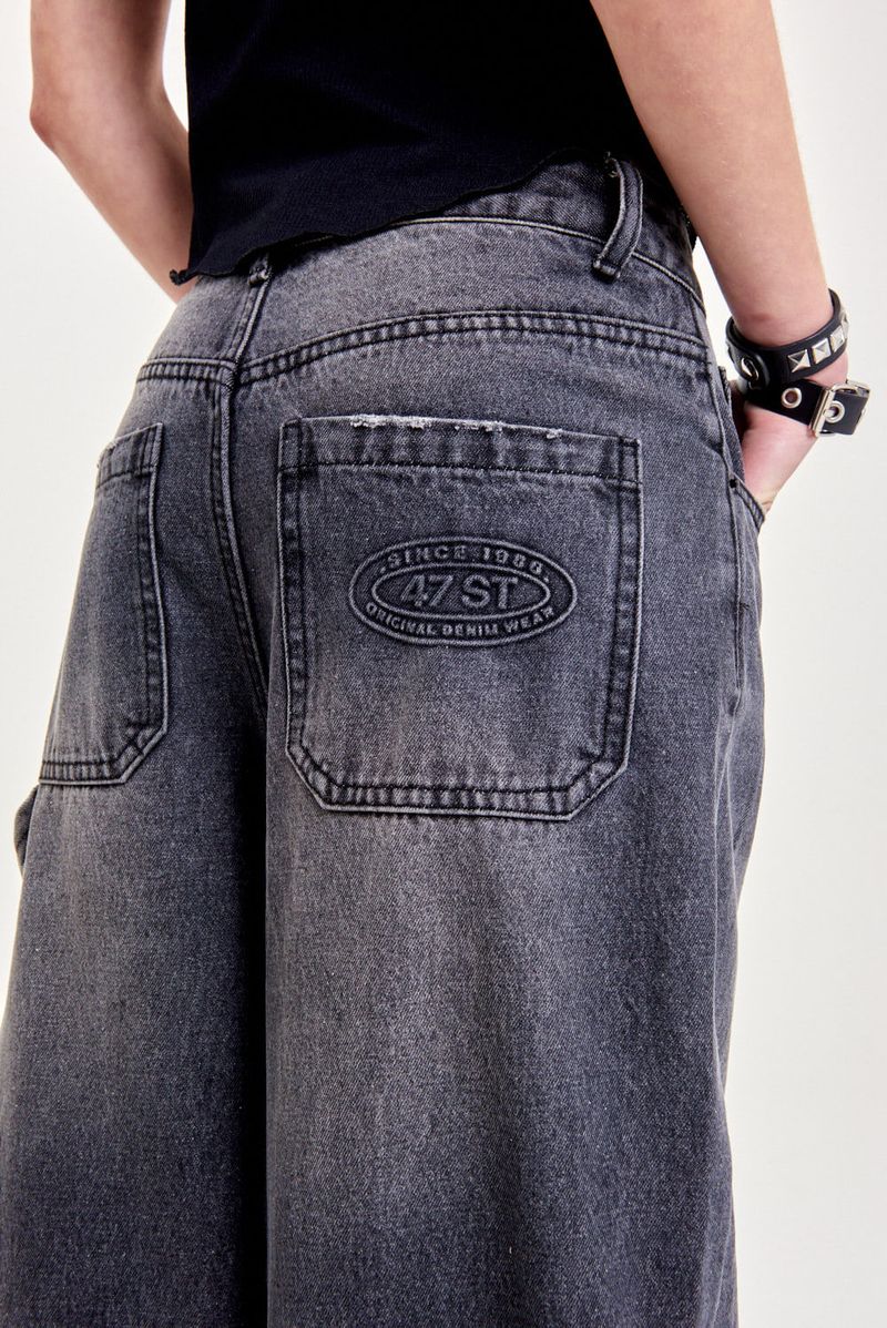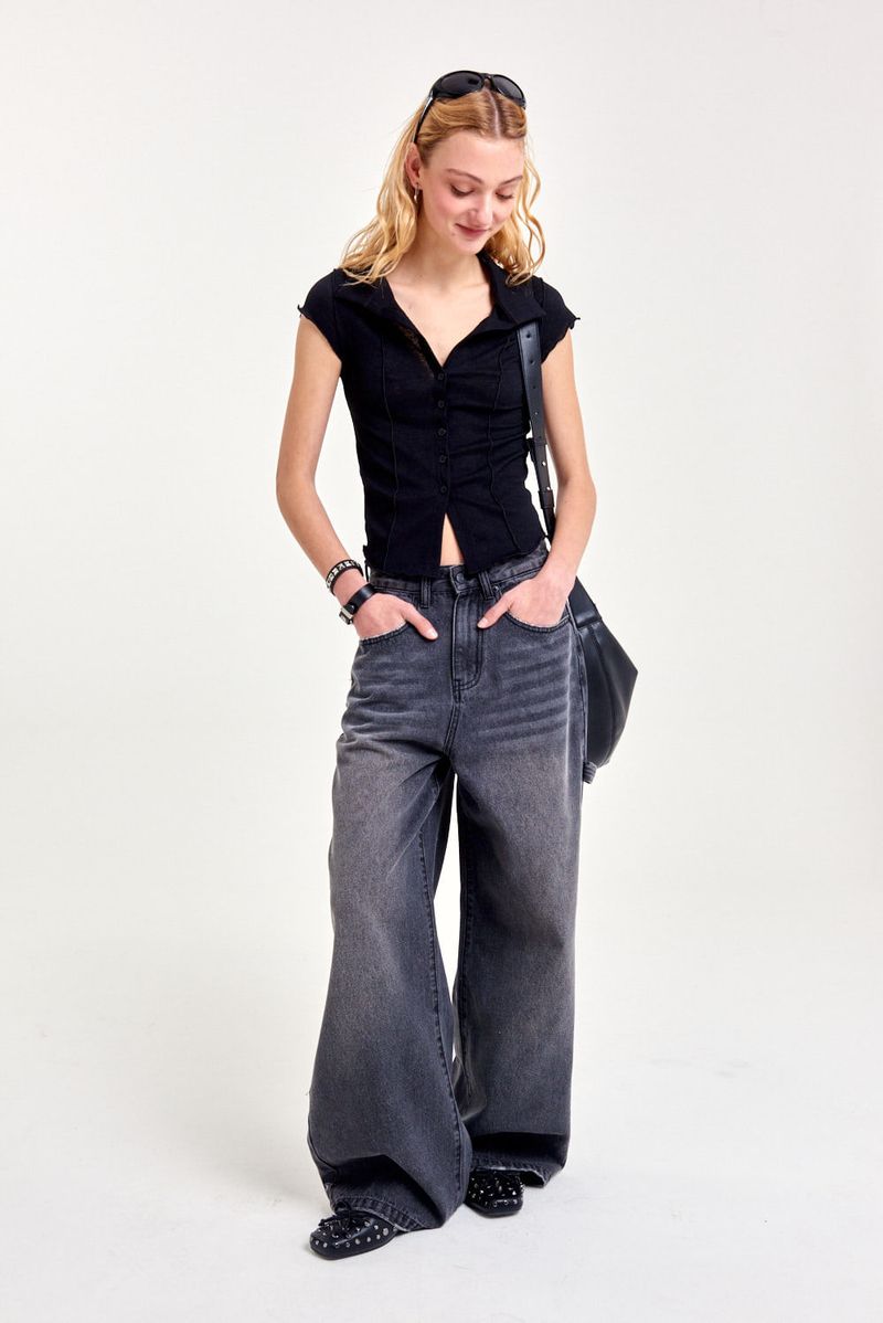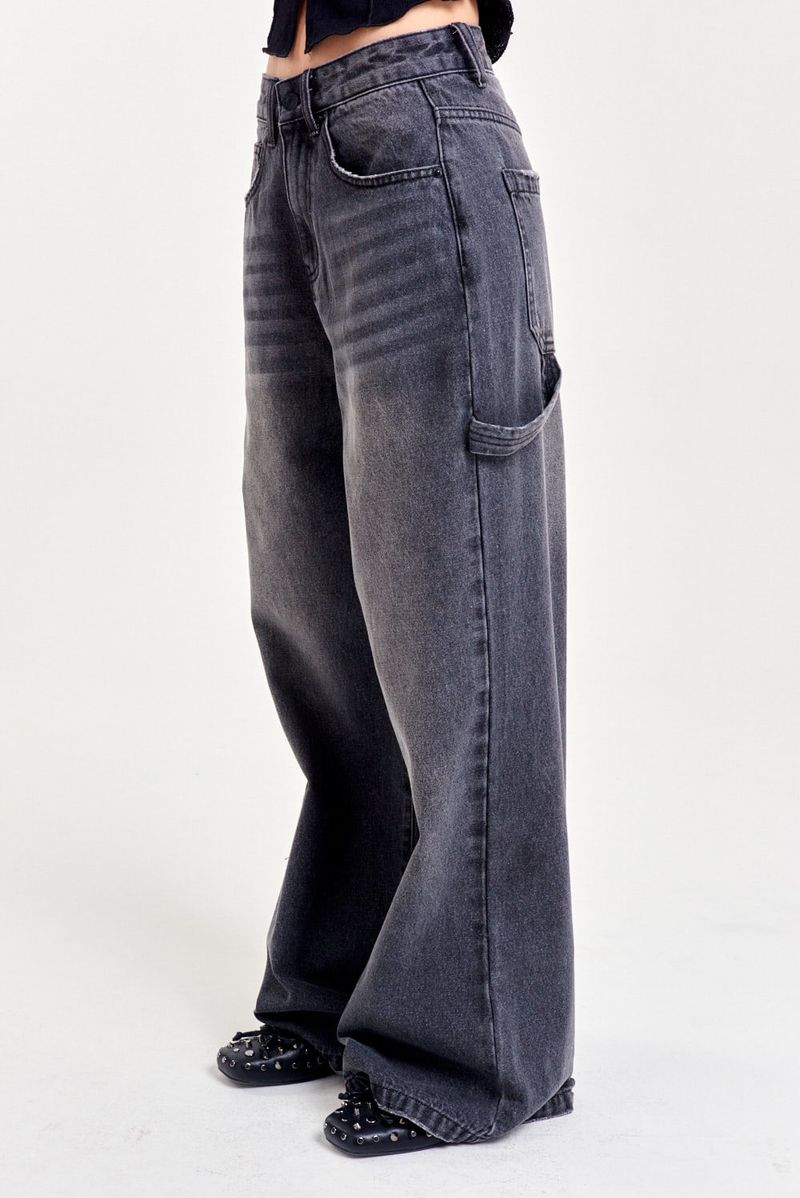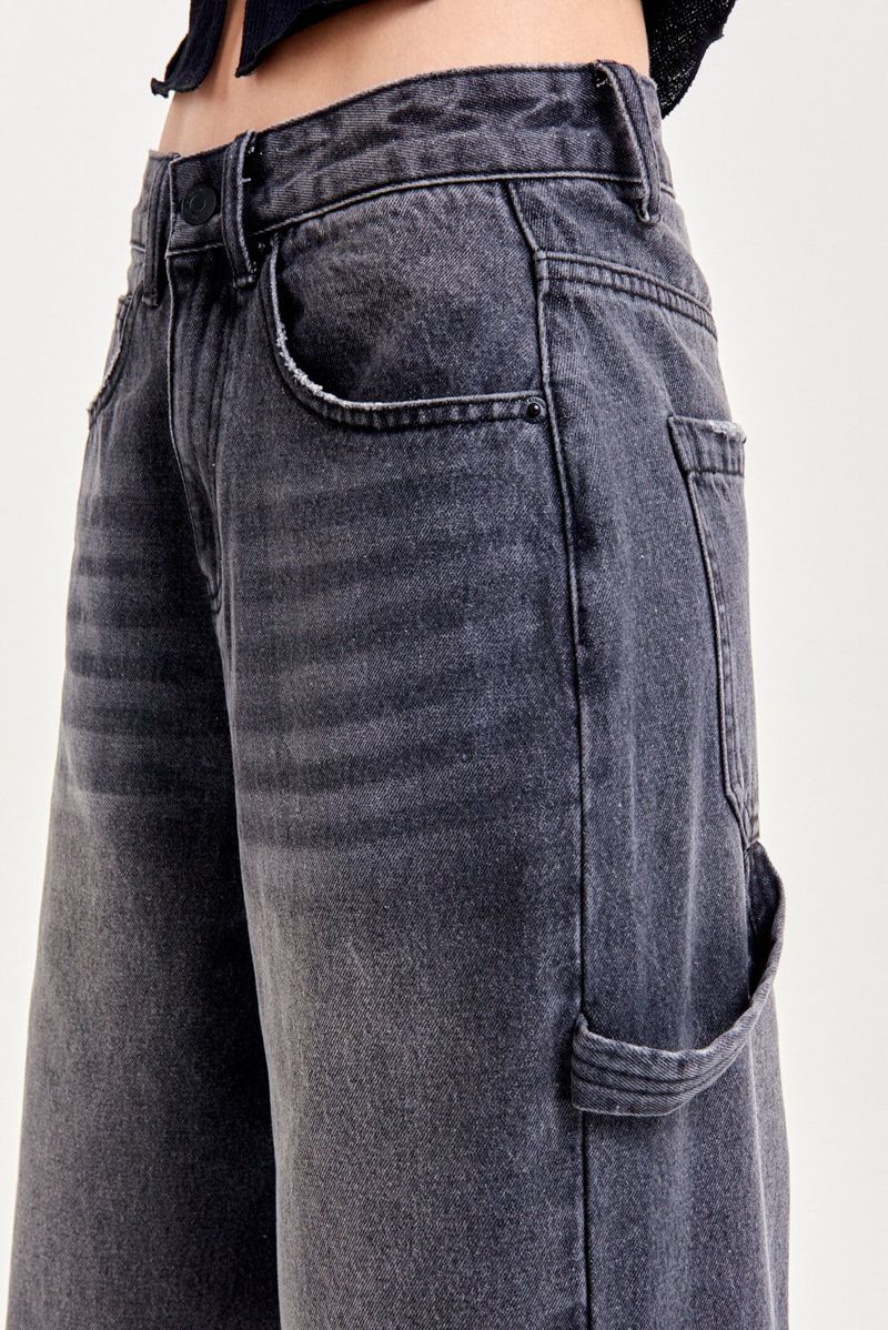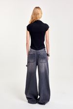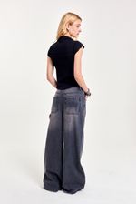 Jean de denim negro gastado con metales a tono. Calce relajado y pierna amplia, con tiro medio que puede usarse como bajo. Lleva tira carpintera como detalle funcional. El lavado es artesanal, por lo que cada prenda es única. Perfecto para llevar con remera estampada y zapatillas deportivas para un look moderno y descontracturado.