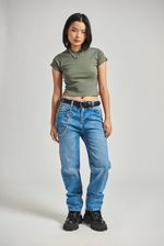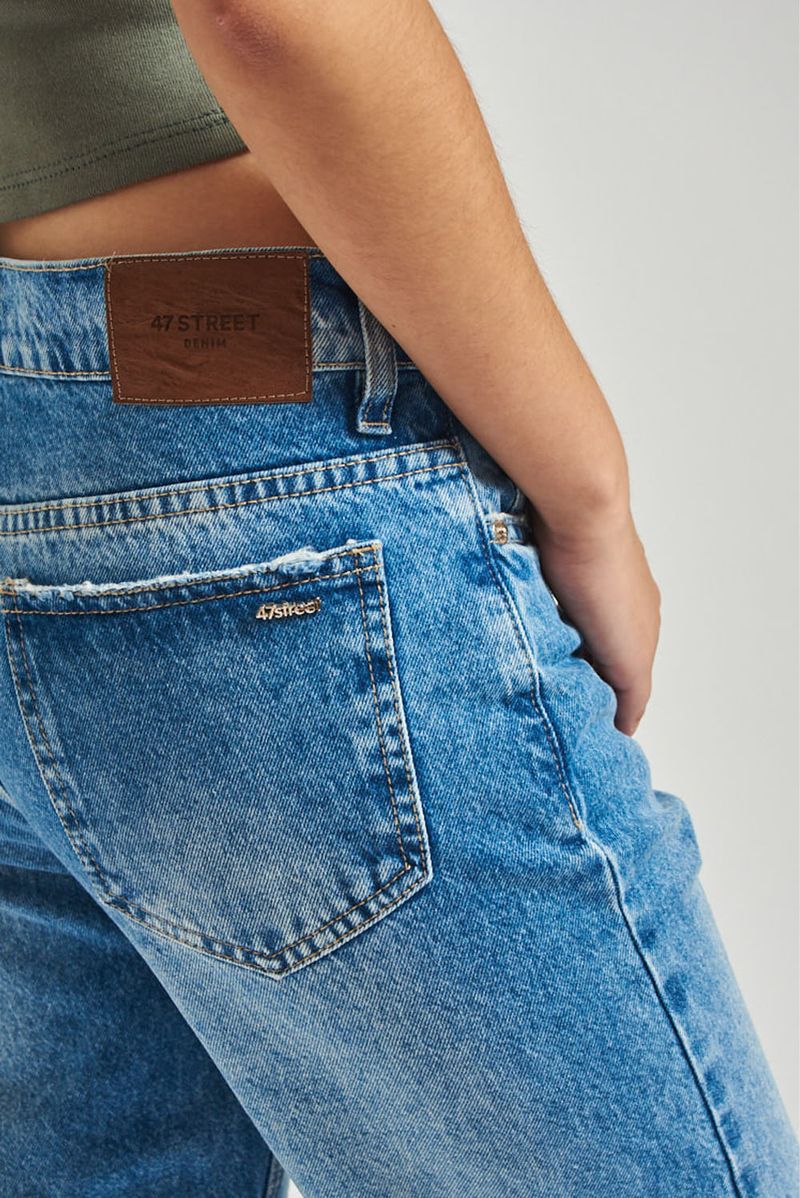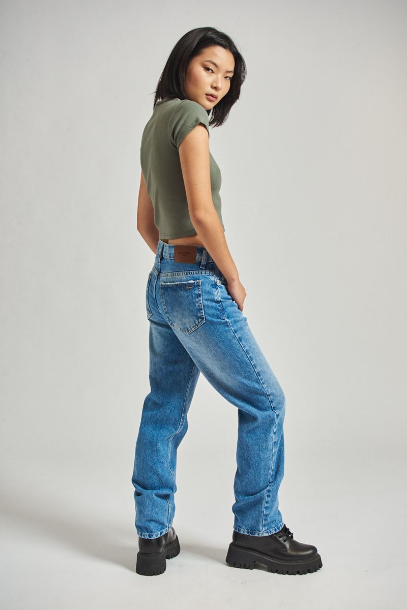 Jean 5 bolsillos tiro medio, piernas rectas.