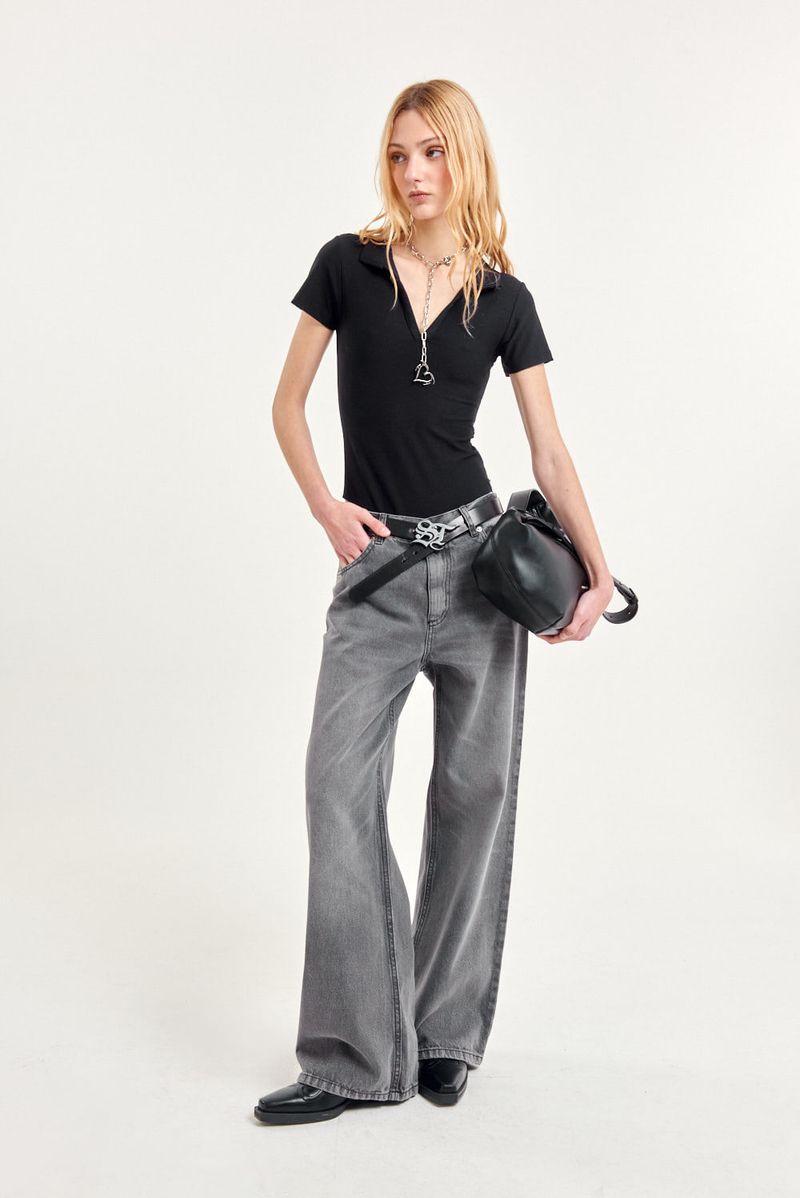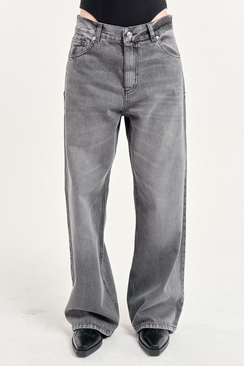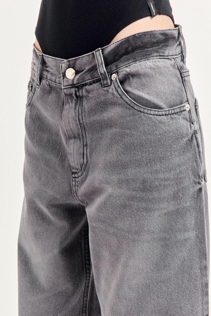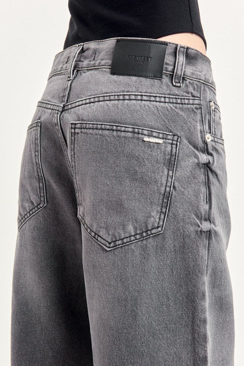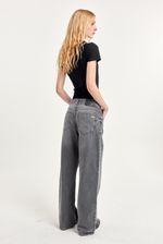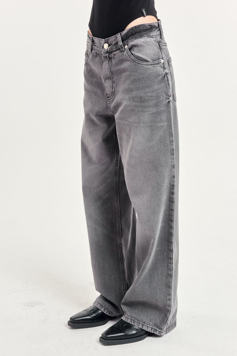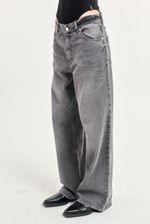 Jean 5 bolsillos calce relajado en denim 100% algodón, calce wide leg con tiro medio, pierna relajada con lavado gris gastado.