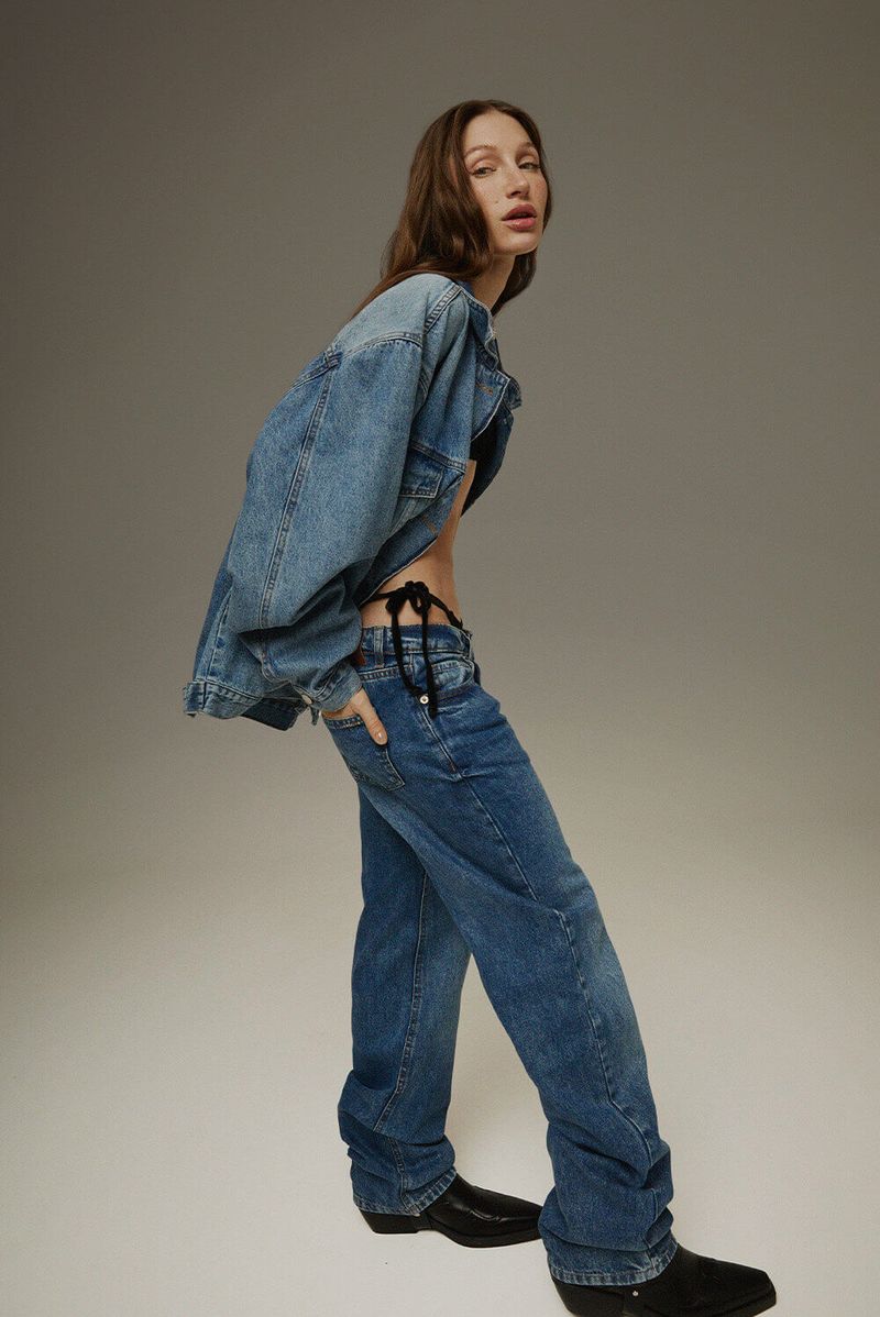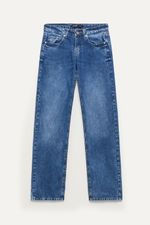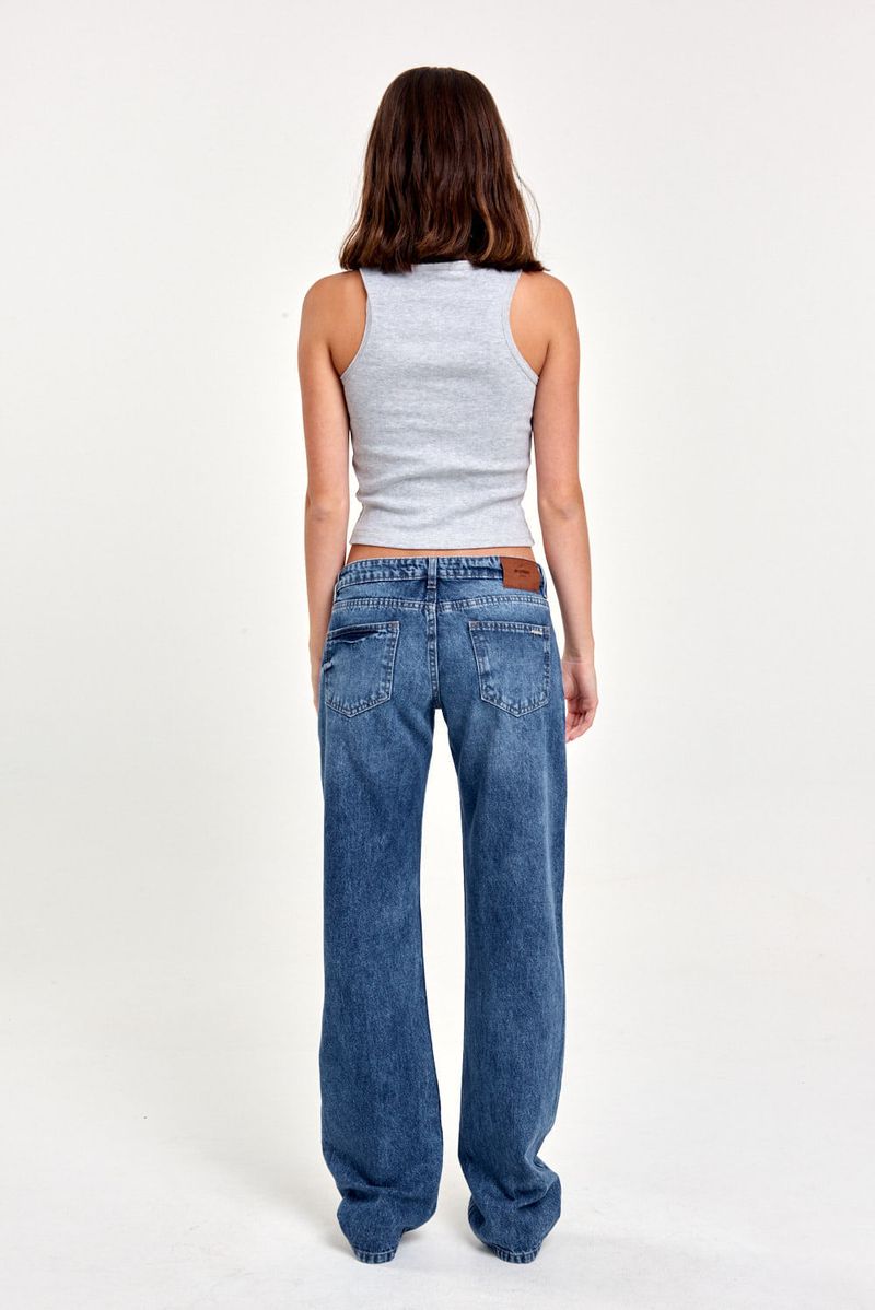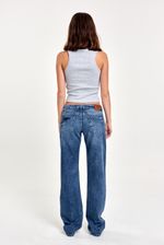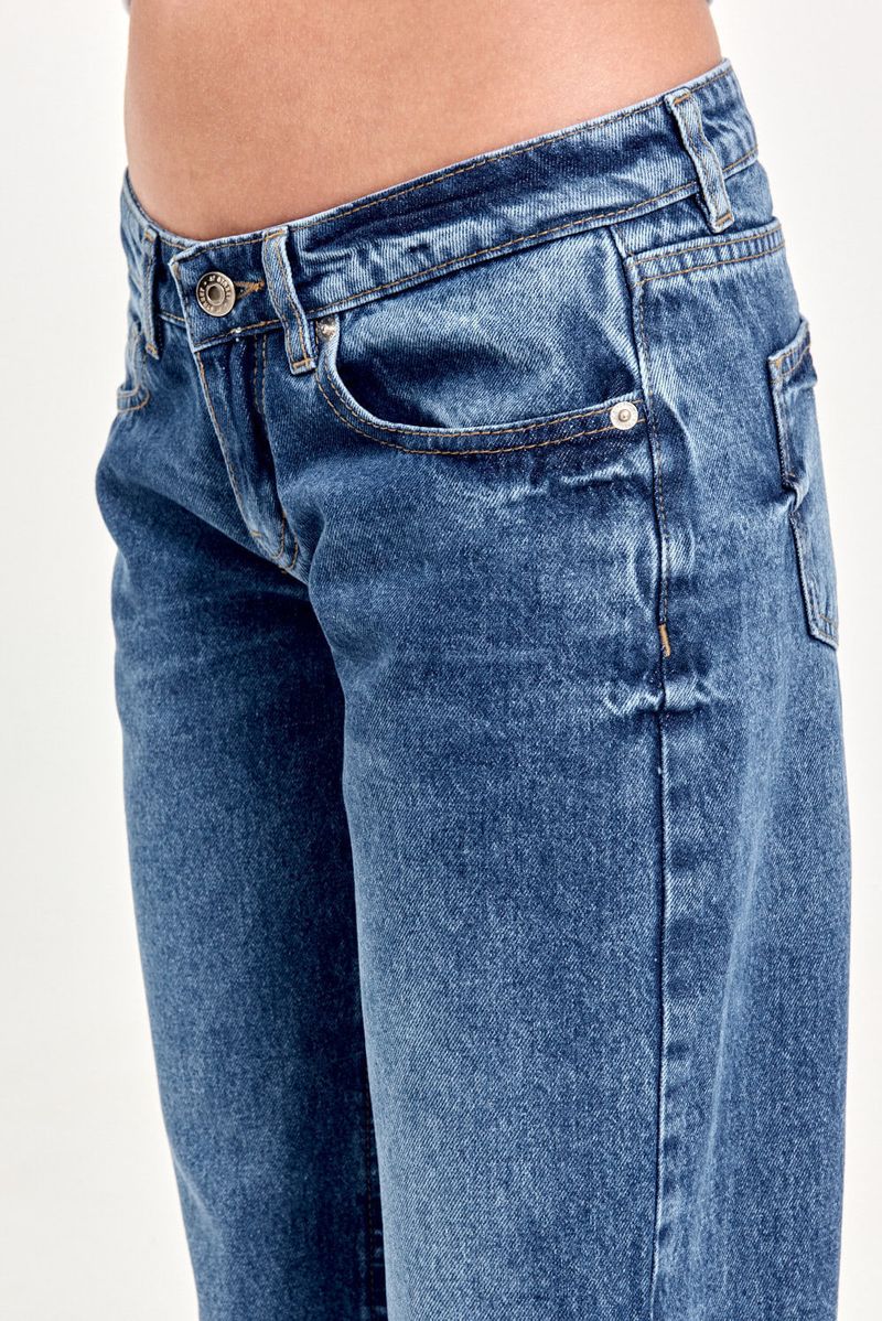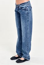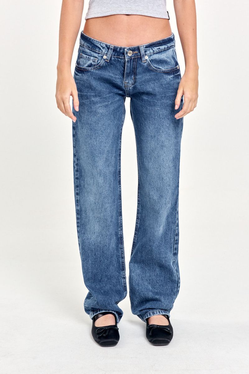 Jean de denim tiro bajo y calce recto. Diseño clásico 5 bolsillos. Perfecto para un estilo relajado y versátil.