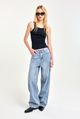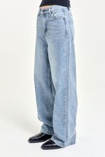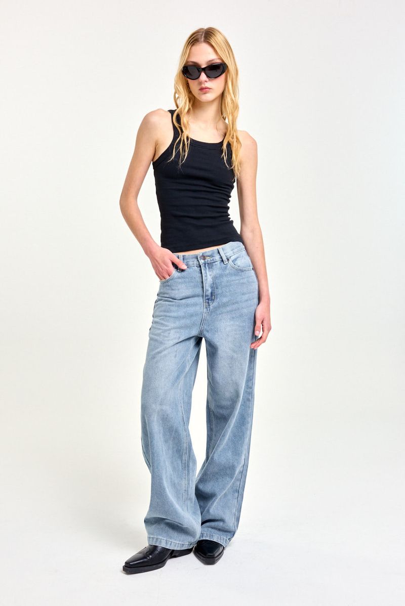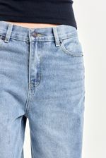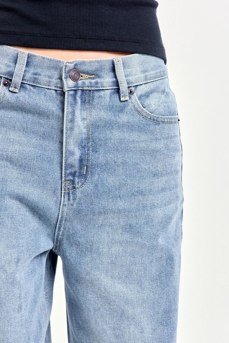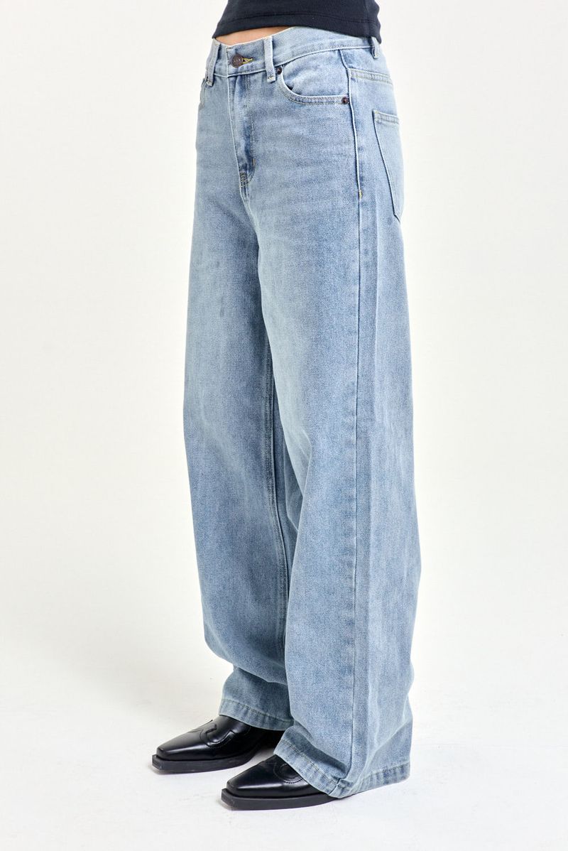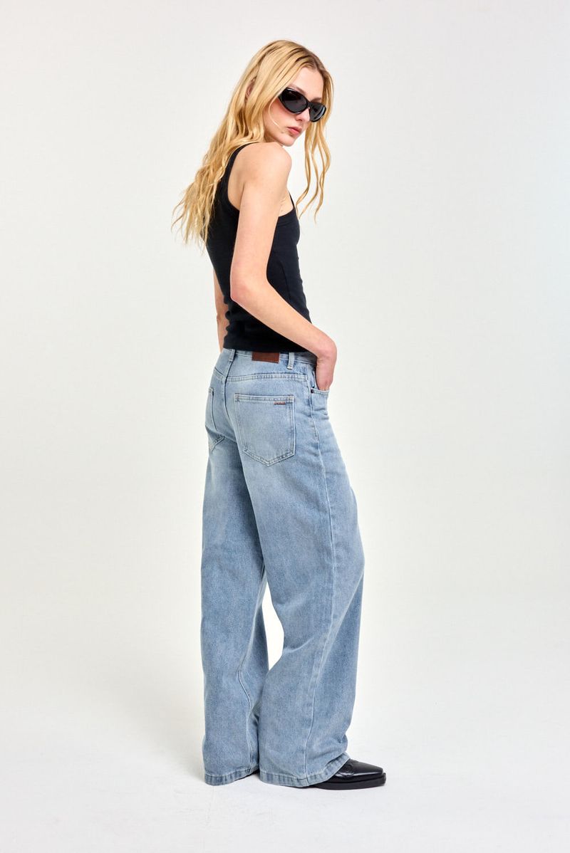 Jean clásico celeste matizado con detalles metálicos color cobre. Tiro medio que, según el talle, puede lucirse como tiro bajo, con piernas amplias y calce relajado que suma comodidad y estilo. Lavado artesanal que hace que cada prenda sea única. Ideal para combinar con tops cortos, remeras básicas o camisas oversize.