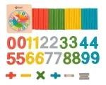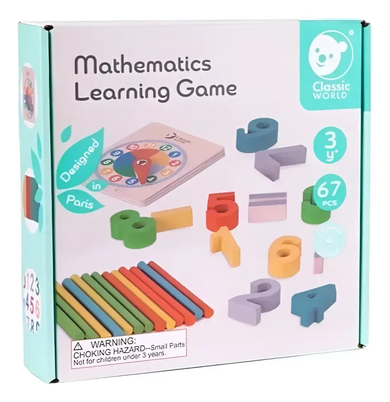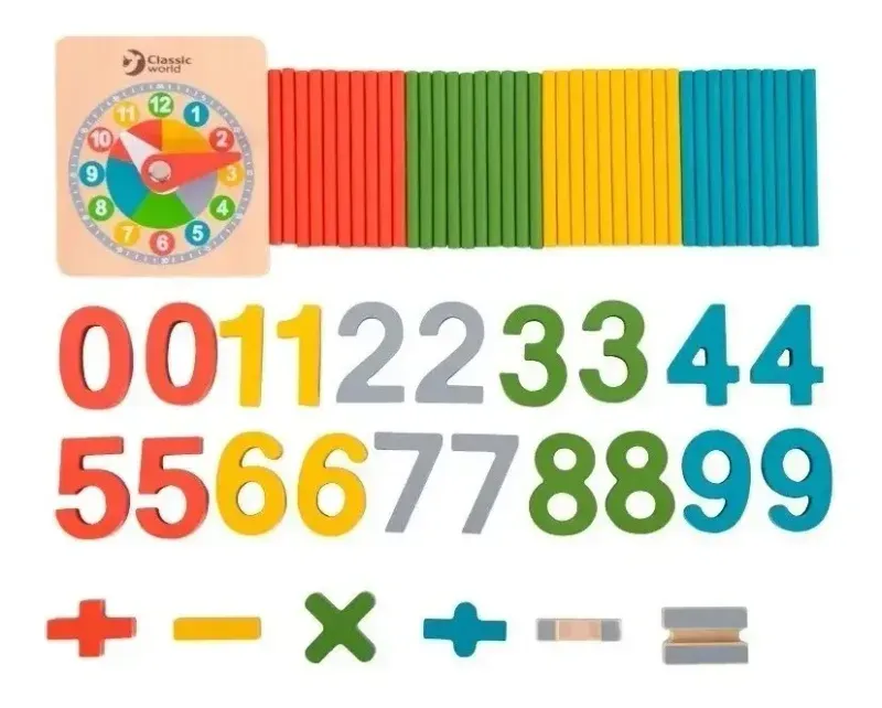 Este juego incluye números, símbolos de operaciones matemáticas básicas, palos para contar y un reloj. Es un juego completo con el que los pequeños podrán aprender los números y a contar de una manera relajada y eficiente.