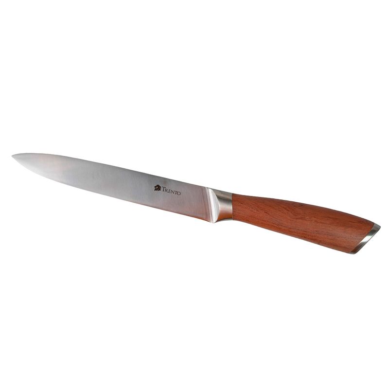 El Juego de Cuchillos Trento Malmo de 5 piezas es la combinación perfecta de elegancia y funcionalidad para tu cocina. Este set premium incluye un cepo de madera que permite organizar y proteger las hojas, manteniendo el filo siempre listo para usar. Cada cuchillo está fabricado con acero inoxidable AISI 420 de alta calidad y cuenta con mangos de madera de palo rosa, conocidos por su durabilidad y su distintivo tono cálido, brindando un equilibrio excepcional y un corte profesional en cada preparación.