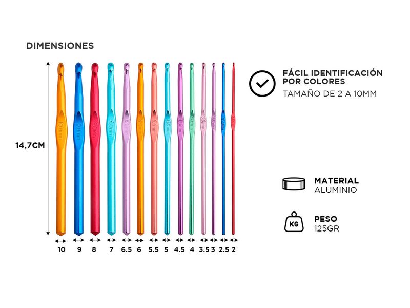 Cada gancho presenta un punto cómodo en la curva, permitiendo que tus manos se deslicen suavemente a través de los bucles de hilo. Las dimensiones claramente marcadas en milímetros y el eje liso facilitan la identificación y selección de la aguja perfecta para cada proyecto. La ligereza de estas agujas no compromete su robustez, haciéndolas ideales tanto para principiantes como para expertos tejedores.