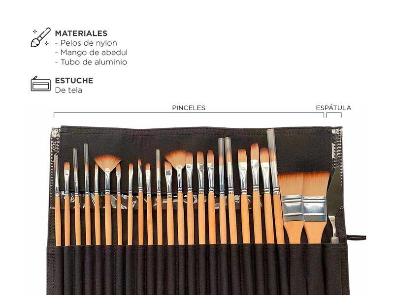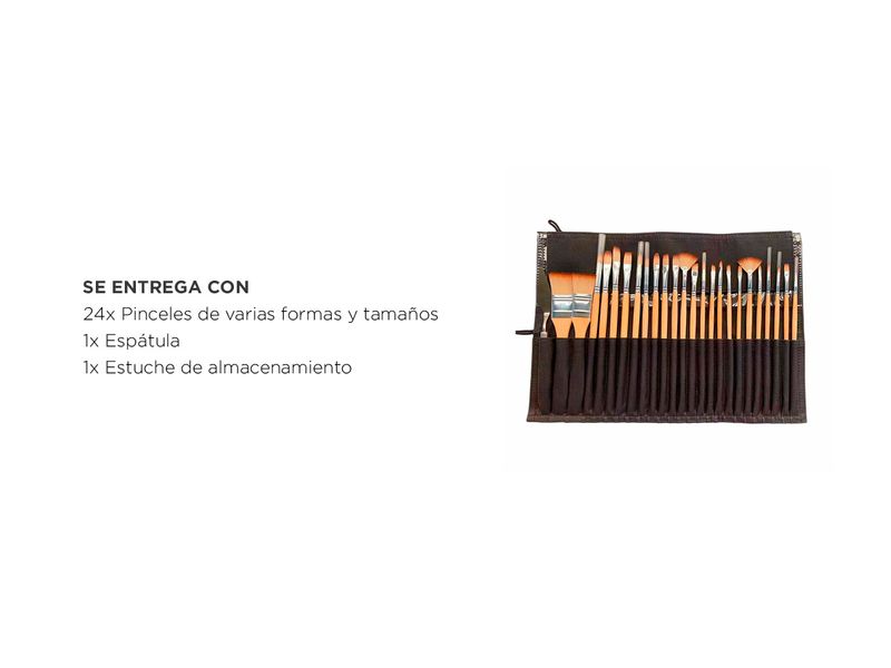 Nuestro set incluye 24 pinceles de varias formas y tamaños, diseñados para satisfacer todas tus necesidades creativas. Desde pinceles planos y redondos hasta pinceles de detalle y de abanico, tendrás la herramienta adecuada para cada técnica y estilo.