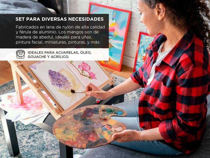 Además, nuestros pinceles son aptos para una amplia gama de técnicas y medios, incluyendo acrílico, acuarela, óleo y gouache. Ya seas un artista principiante o experimentado, este set te brindará las herramientas necesarias para explorar y expresar tu creatividad sin límites.