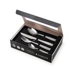 Cubiertos incluidos: Cuchara de mesa, cuchara de té, tenedor de mesa y cuchillo de asado dentado