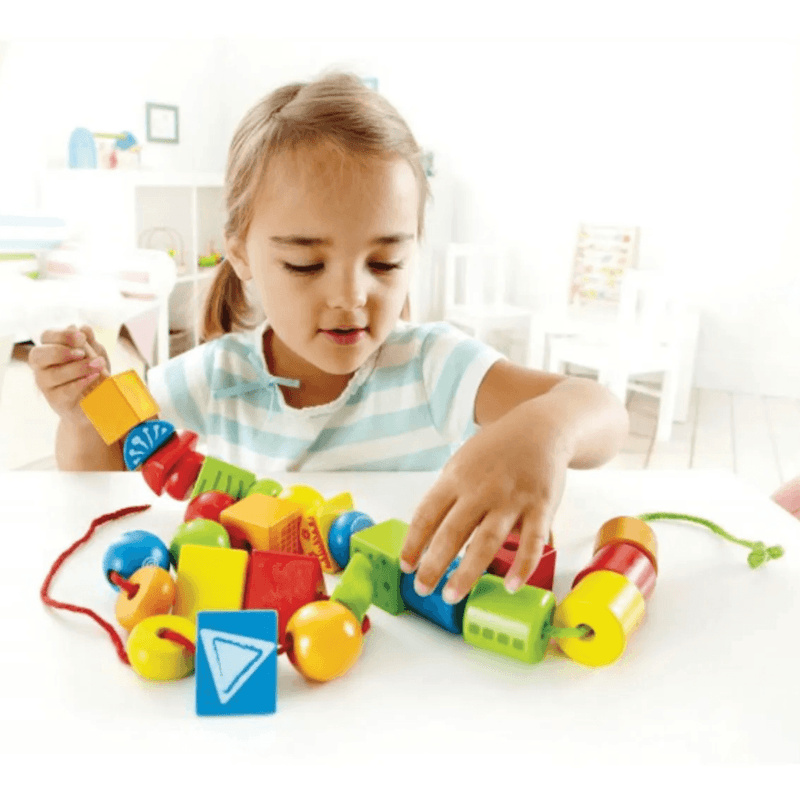 Este juego de formas para enlazar de madera favorece el desarrollo de la coordinación, la movilidad y la actividad física de los más chicos..