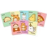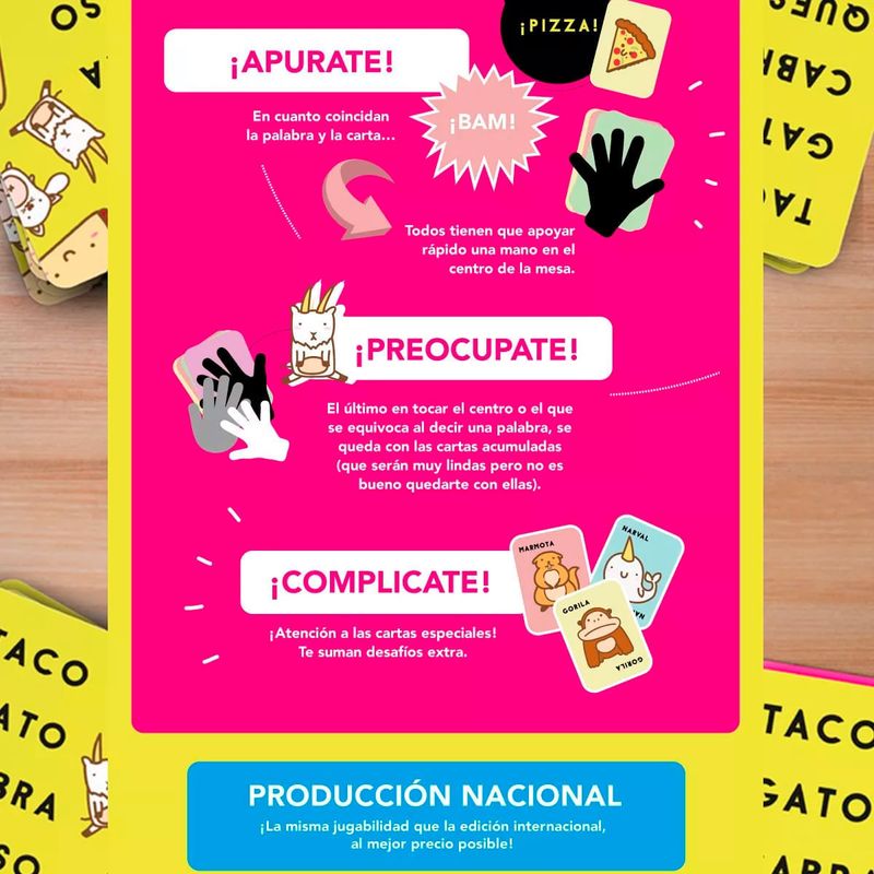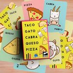 Taco Gato Cabra Queso Pizza los jugadores deben decir en orden las 5 palabras bizarras del título mientras revelan cartas. Cuando la palabra dicha coincide con la carta revelada, ¡todos deben poner la mano en el centro de la mesa! El último en hacerlo se lleva el montón. Gana el jugador que logre descartarse primero de todas sus cartas.