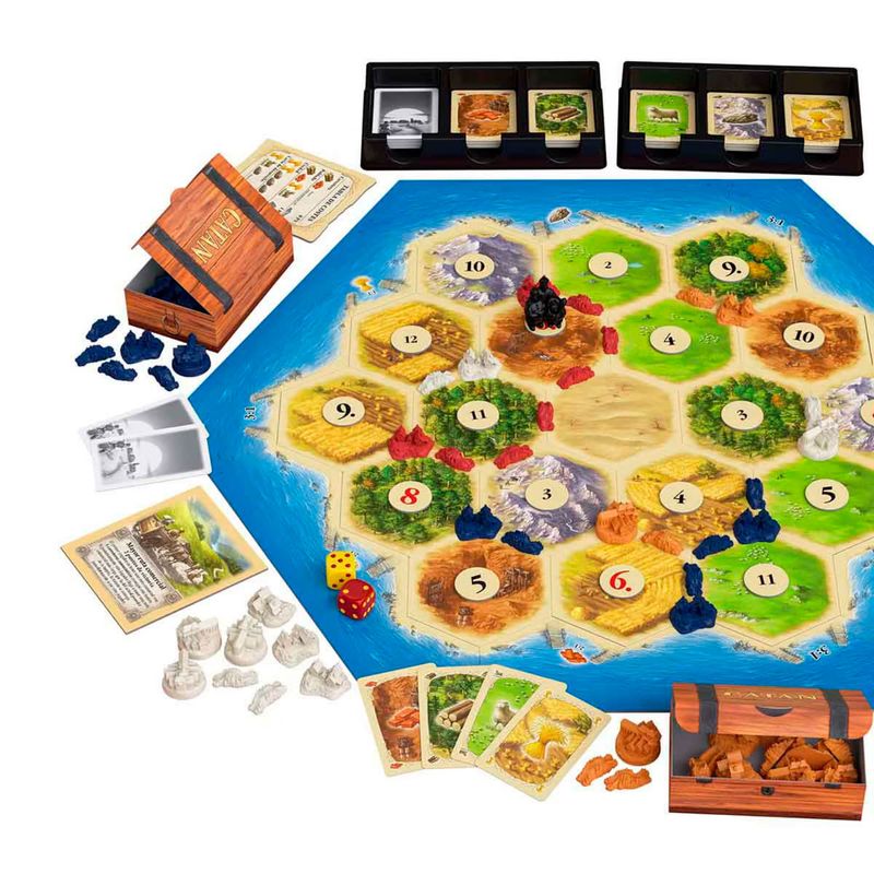 -Incluye 19 hexágonos de terreno, 6 piezas de marco, 18 fichas numeradas, 95 cartas de materia prima y 25 cartas de desarrollo.
