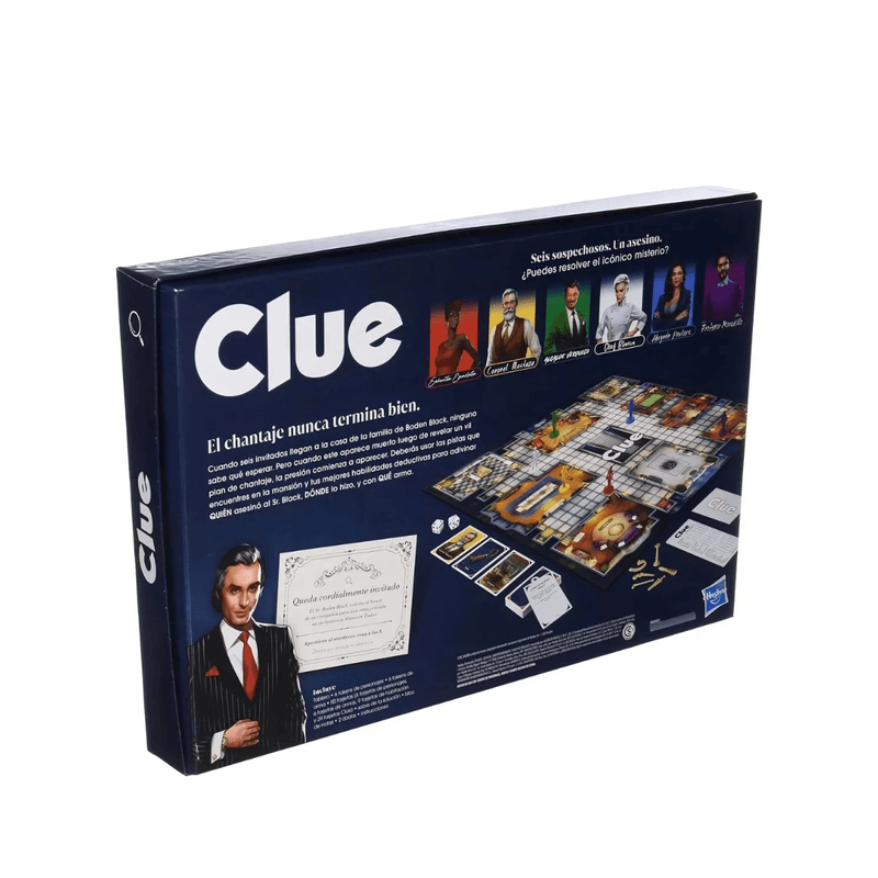 Juego de mesa de misterio donde los jugadores investigan para descubrir quién cometió el crimen, con qué arma y en qué habitación. Cuando 6 invitados llegan a la mansión de Bond Black ninguno de ellos sabe qué les espera. Pero cuando su anfitrión aparece muerto tras revelar un siniestro complot de extorsión, la presión aumenta. Compite contra los demás jugadores para resolver el caso, reuniendo pistas y descartando sospechosos. . ¡Sé el primero en hacer la acusación correcta para ganar la partida!