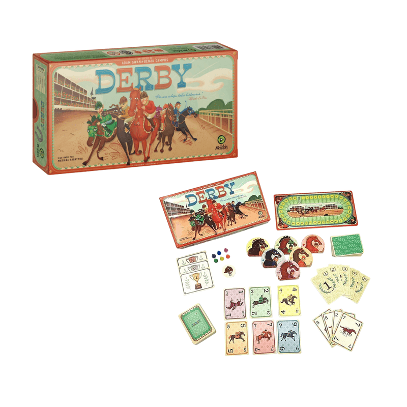 ¡Viví la emoción de las carreras con Derby! Un juego de estrategia, intuición y suerte donde cada jugador apuesta en secreto por su caballo favorito. Usá tus cartas para acelerar o frenar a los competidores, pero ¡ojo! no siempre el que llega primero es el que más paga. Ganá puntos a lo largo de 5 carreras y convertite en el mejor apostador de la pista.